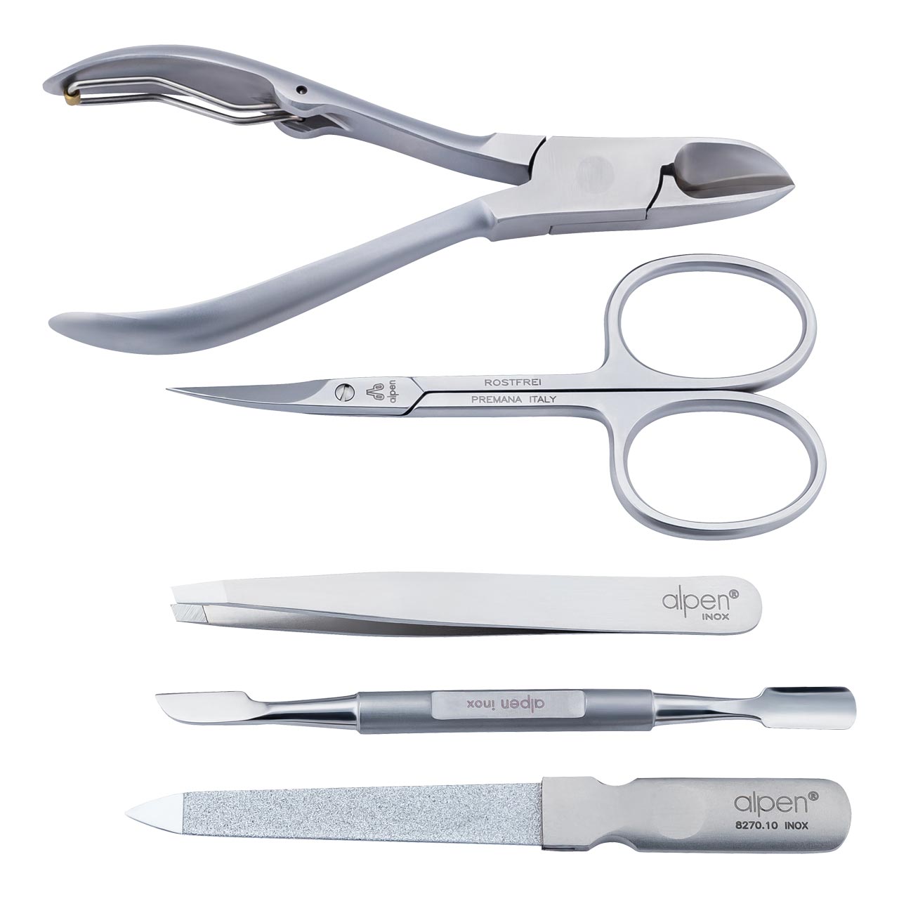 Maniküre-Set von ALPEN. 5-teilig mit Hautschere, Nagelzange, Pinzette, doppelseitigem Hautnagelschieber/-messer und Nagelfeile. Alle Artikel aus rostfreiem Edelstahl. Inklusive schwarz/braunem Lederetui mit Druckverschluss.