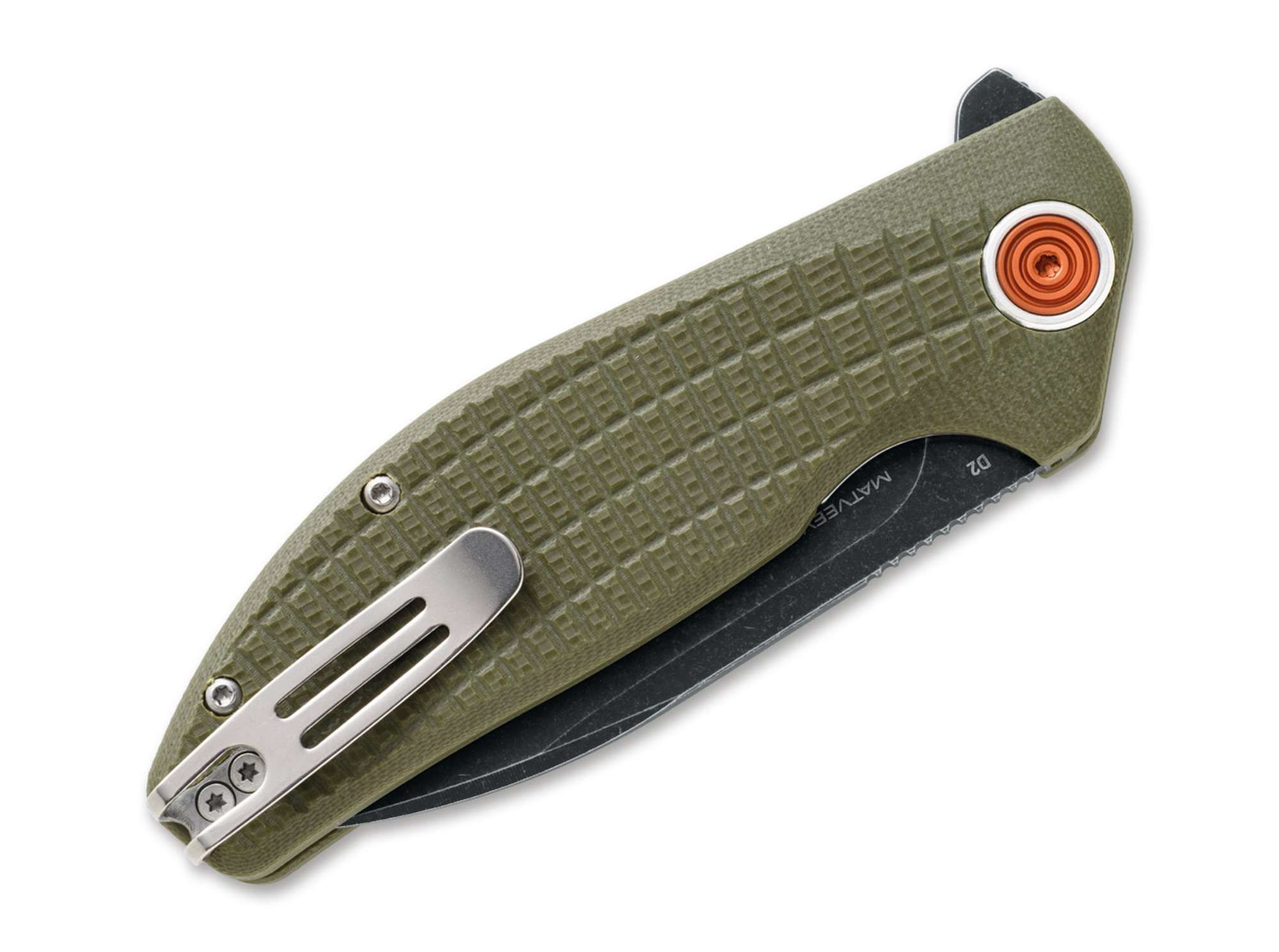 Wenn es akut wird ist das Black Fox Acutus immer zur Stelle. Der praktische EDC-Folder ist mit einer schnitthaltigen Klinge aus D2 sowie einem texturierten Griff aus grünem G10 ausgestattet. Jimpings am Klingenrücken erhöhen die Arbeitssicherheit, während Flipper und Liner Lock ein bewährtes Gespann bilden. Die Orange anodisierte Klingenachsschraube sorgt für den nötigen Hingucker bei dem taktisch anmutenden Messer. Mit Deep-Carry-Clip (Tip-Up/r).