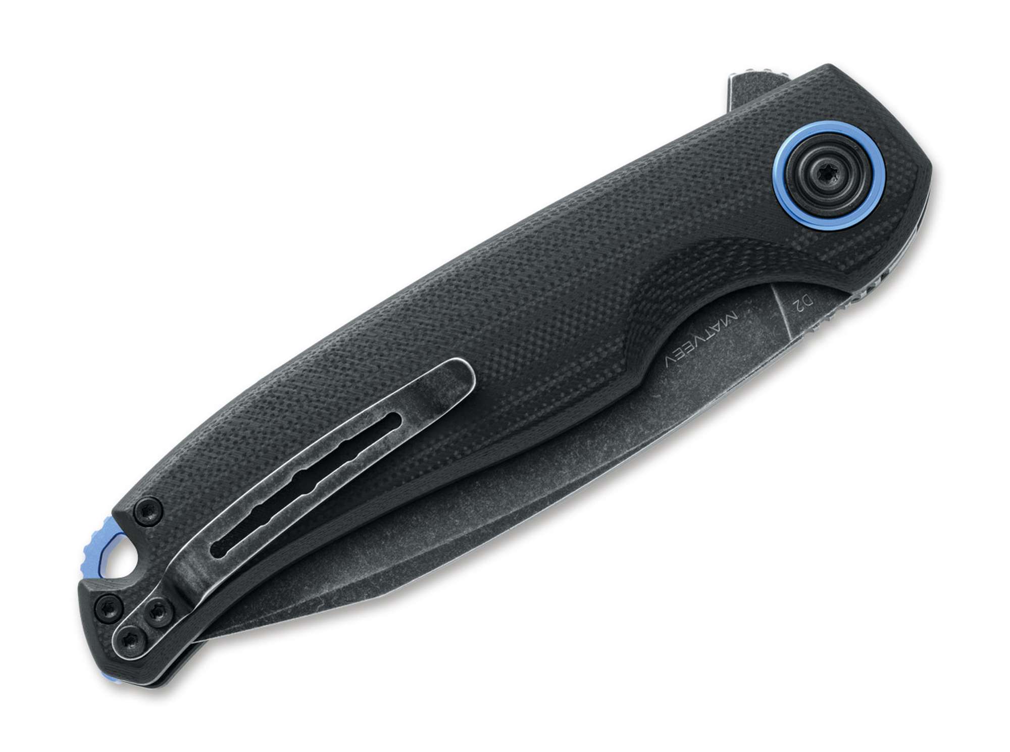 Das BlackFox Argus lässt widerspenstige Schneidarbeiten nicht aus den Augen. Die schnitthaltige D2 Klinge öffnet per Flipper und verrichtet ihr Tageswerk zuverlässig. Der ergonomische Griff aus schwarzem G10 liegt sicher in der Hand und beherbergt den stabilen Liner Lock. Definitiv ein Blickfang sind die blau anodisierte Klingenachsschraube sowie die praktische Fangriemenöse. Mit Tip-Up Clip (r).