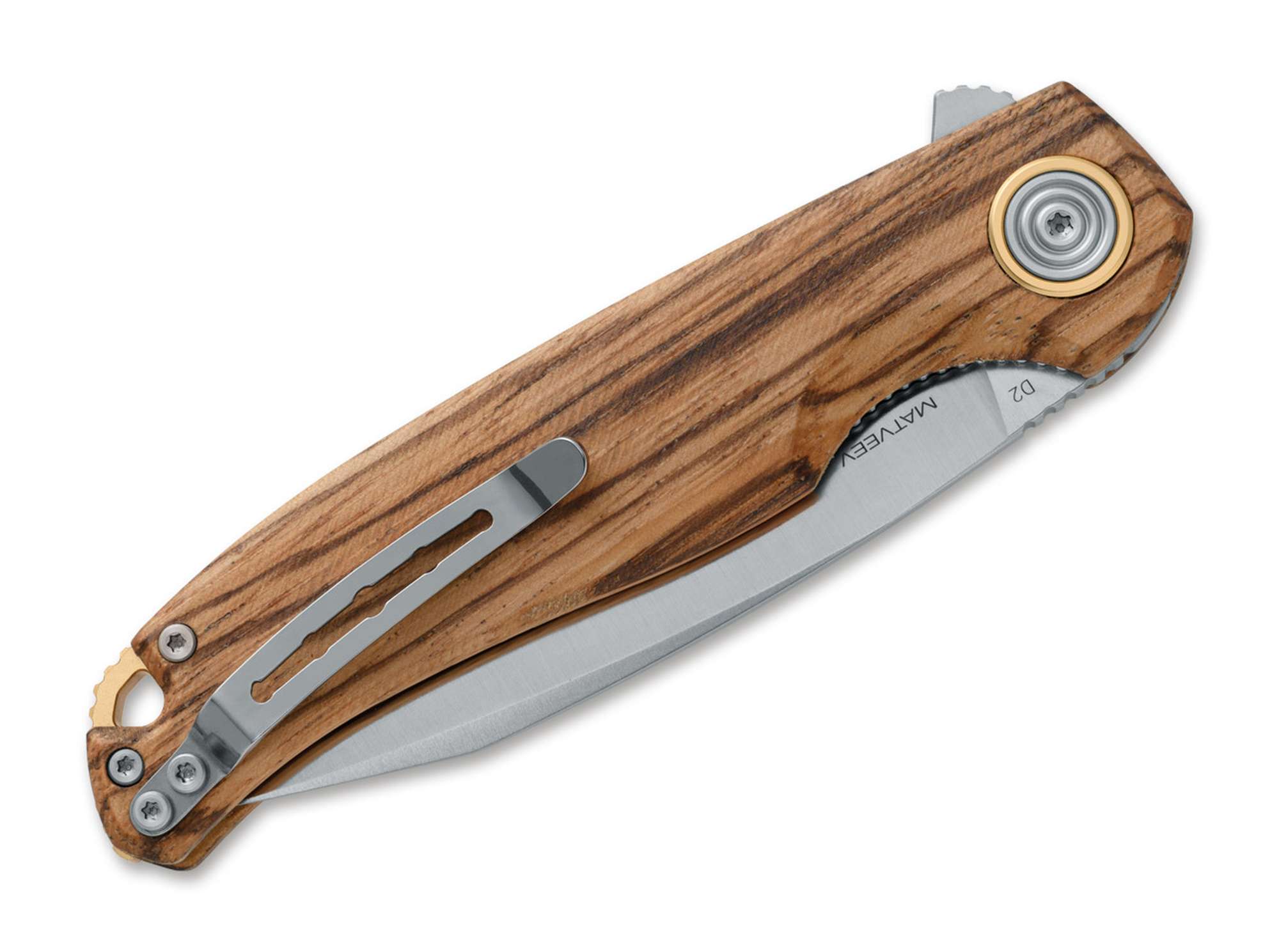 Das BlackFox Argus lässt widerspenstige Schneidarbeiten nicht aus den Augen. Die schnitthaltige D2 Klinge öffnet per Flipper und verrichtet ihr Tageswerk zuverlässig. Der ergonomische Griff aus edlem Zebraholz liegt sicher in der Hand und beherbergt den stabilen Liner Lock. Definitiv ein Blickfang sind die gold anodisierte Klingenachsschraube sowie die praktische Fangriemenöse. Mit Tip-Up Clip (r).