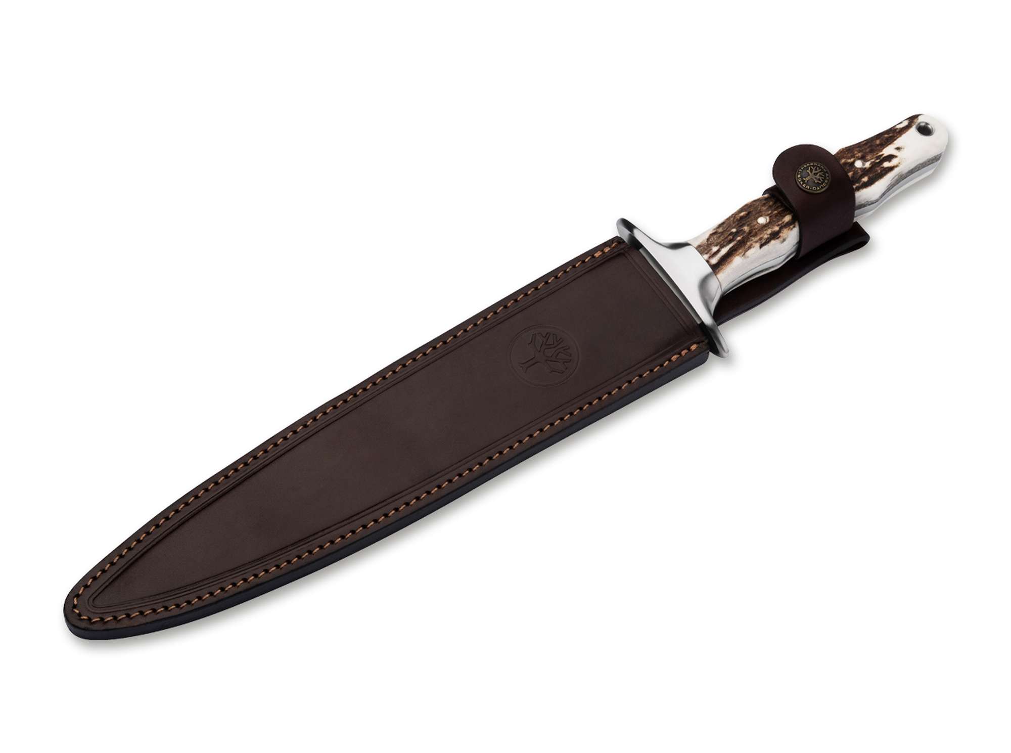 Das Böker Arbolito Colmillo ist als klassischer Hirschfänger mit einer langen Dolchklinge ausgestattet und beeindruckt mit seiner stabilen Vollerl-Bauweise sowie seiner beachtlichen Größe selbst erfahrene Jäger.. Die beidseitig abgezogene Klinge aus ACX 390 ist mit einem feinen Satin-Finish versehen, der ausladende Handschutz besteht aus Neusilber. Für die ergonomisch geformten Griffschalen kommt traditionelles Hirschhorn zum Einsatz, das mit den Neusilbernieten im Griff die waidmännische Anmutung des feststehenden Jagdmessers zusätzlich unterstreicht. Mit Fangriemenöse und hochwertiger Gürtelscheide aus braunem Leder.