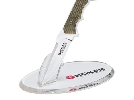 Der Acryl-Messerständer mit Böker Aufdruck hält ein Taschenmesser oder kleineres feststehendes Messer per Magnet und einer kleinen Haltenase zuverlässig in einer sehr schönen "Vitrinenposition". Achtung: Bei ausgeprägt angeschliffener Fehlschärfe oder zu hohem Griffgewicht ist die Verwendbarkeit eingeschränkt. Grundplatte 15 x 10 cm. Höhe ca. 5 cm.