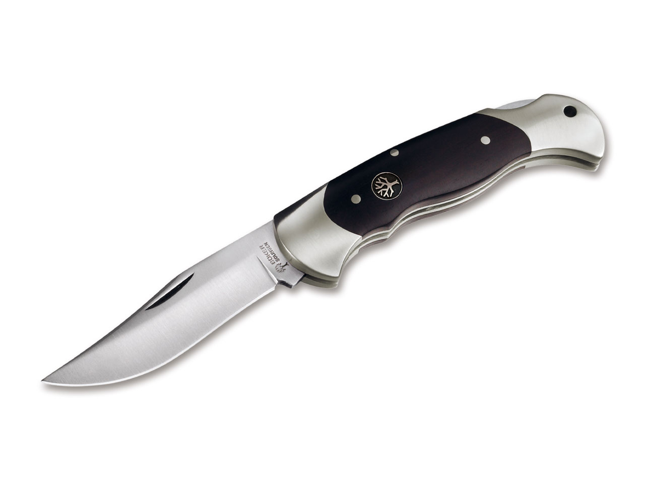 Das Böker Scout ist seit 1985 fest mit unserem Namen verbunden. Ob damals jemand damit gerechnet hätte, dass das Taschenmesser zu einem der erfolgreichsten und beliebtesten Messer aus unserem Programm wird, vermag heute niemand mehr zu sagen. Aber diese vielen Jahre sind in Zeiten kurzlebiger Modeerscheinungen, die auch auf dem Messermarkt nicht ungewöhnlich sind, auf jeden Fall eine Besonderheit. Die Varianten des Scouts waren in dieser Zeit wohl so zahlreich wie von kaum einem anderen Modell, allerdings wurde an den Eckdaten nie etwas geändert. Der äußerst stabile Körper aus einem Stück Neusilber wird im Sinterverfahren hergestellt und anschließend poliert. Beim Sintern werden die Ausgangsstoffe vermischt, durch Erwärmung miteinander verbunden und in die gewünschte Form gebracht. Die hohlgeschliffene Klinge wird aus Cronidur 30 gefertigt und trägt mit ihrer einprägsamem Form zum unvergleichlichen Erscheinungsbild des Scouts bei. Der stickstofflegierte Klingenstahl, der selbst bei der NASA im Space Shuttle verbaut wird, macht dieses Prachtstück zu einem echten Überflieger. Herausragende Korrosionsresistenz und eine extreme Schnitthaltigkeit zeichnen den Stahl aus, den Böker als erster Hersteller exklusiv im Sport- und Jagdmesserbereich verwendet. Ein klassischer Backlock übernimmt die Verriegelung und hält die Klinge sicher offen. Die im Innern des Griffes verborgene Mechanik besteht aus einer Bolzenwippe und einer Feder. Bei ausgeklappter Klinge greift die Bolzenwippe in eine Aussparung der Klinge und arretiert sie dadurch. Das hintere Ende der Bolzenwippe wird nicht vollständig vom Griff verdeckt, sondern liegt am Griffrücken zum Teil frei, damit sie betätigt werden kann. Wird nun das freiliegende hintere Ende der Bolzenwippe gedrückt, hebt sich der Haken aus der Kerbe, sodass sich die Arretierung löst und die Klinge eingeklappt werden kann. Die angenehm geformten Griffschalen aus edlem, zertifiziert importiertem Grenadillholz runden das harmonische Bild des Klassikers ab.