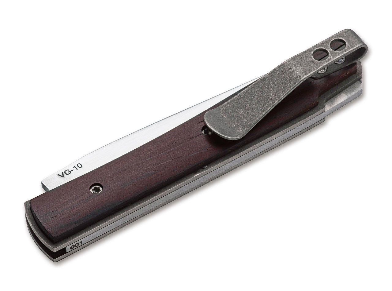 Die kleinste Version des Böker Plus Urban Trapper von Brad Zinker ist dank des neuartigen, patentierten Drahtbügel-Backlocks nun mit einem weiteren Verschlussmechanismus erhältlich. Durch den platzsparenden Drahtbügel wird keine zusätzliche Oberfeder mehr benötigt, wodurch der Klinge deutlich mehr Platz im Griff zur Verfügung steht. Die mit einem feinen Hairline-Finish versehene Klinge aus VG-10 ist mit einem Nagelhau zur Zweihandbedienung ausgestattet. Die edlen Griffschalen aus ausgesuchtem Cocoboloholz verdeutlichen den edlen Charakter des überaus leichten Gentlemanmessers. Mit Deep-Carry-Clip (Tip-up/r) und einem hochwertigen Nylonetui.