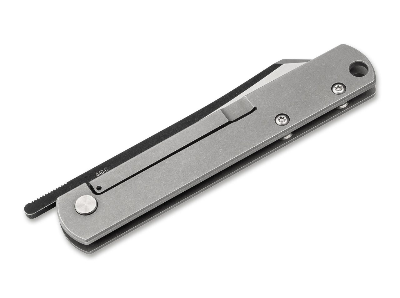 Das elegante Böker Plus Zenshin erinnert an die weltweit bekannten Higonokami Taschenmesser, die bereits seit 1896 in der japanischen Stadt Miki gefertigt werden. Anders als bei seinen historischen Vorbildern besteht der Griffkörper des Gentlemanmessers allerdings nicht aus einem einzigen Stück gefaltetem Metall, sondern aus flachen Edelstahl-Griffschalen, die mit einem matten Stonewash-Finish versehen sind. Die flach bauende Konstruktion verzichtet dabei auf zusätzliche Liner und liegt angenehm in der Hand. Die Klinge aus 440C ist mit einem aufwendigen Two-Tone-Finish und einem Flachschliff versehen. Sie wird per Klingensporn geöffnet und von einem Framelock sicher arretiert. Mit Fangriemenöse.