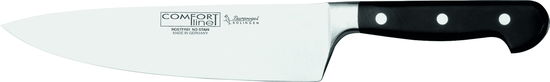 Die 20 cm lange Klinge ist aus einem Stück Chrom-Molybdän-Vanadium.Stahl X 50 CrMoV 15 geschmiedet. Das handliche Kochmesser eignet sich hervorragend zum Schneiden und Wiegen. Besonders geeignet für Hartkäse. Der handsympathische Griff besteht aus POM Kunststoffschalen, welche durch Edelstahlnieten am Messer angebracht sind.