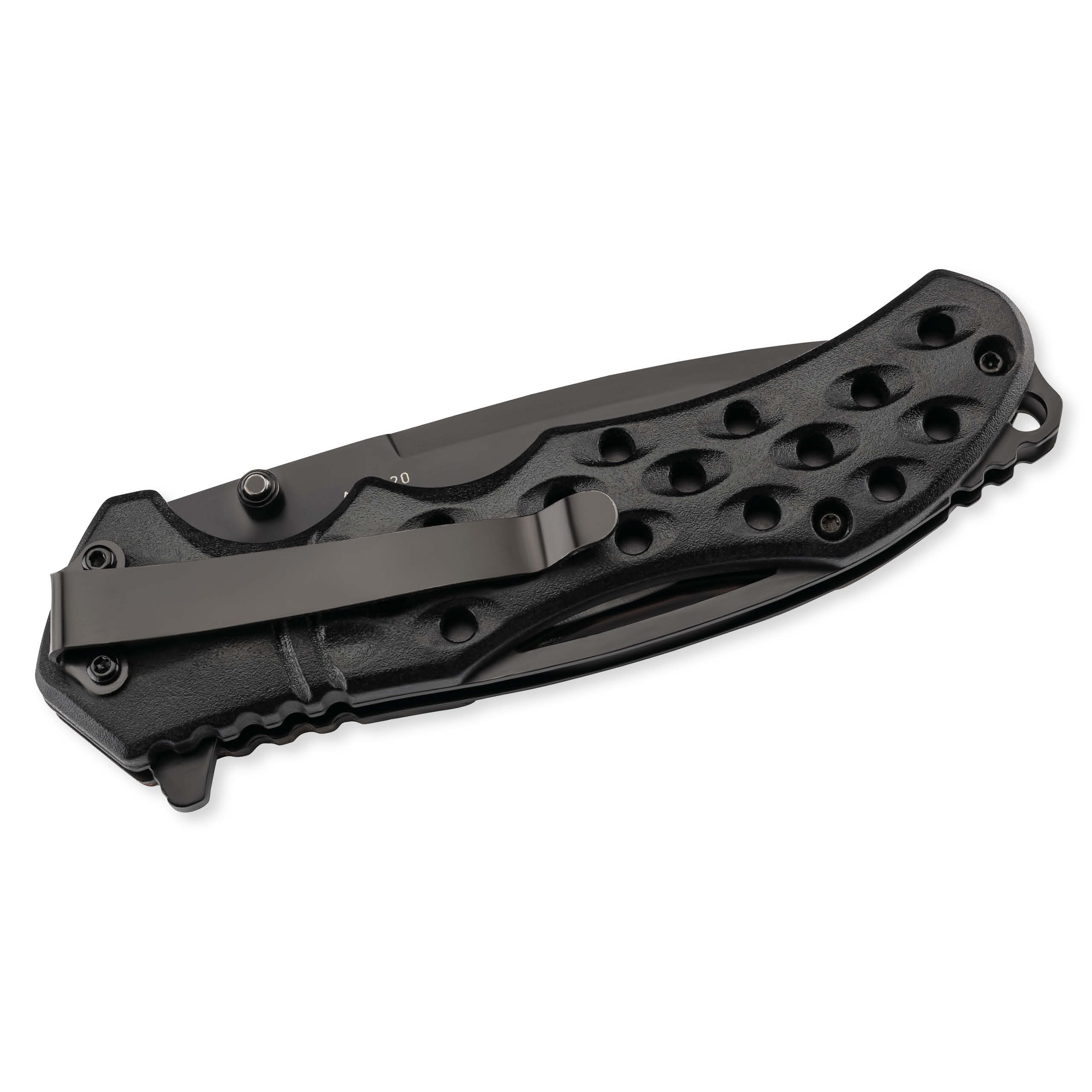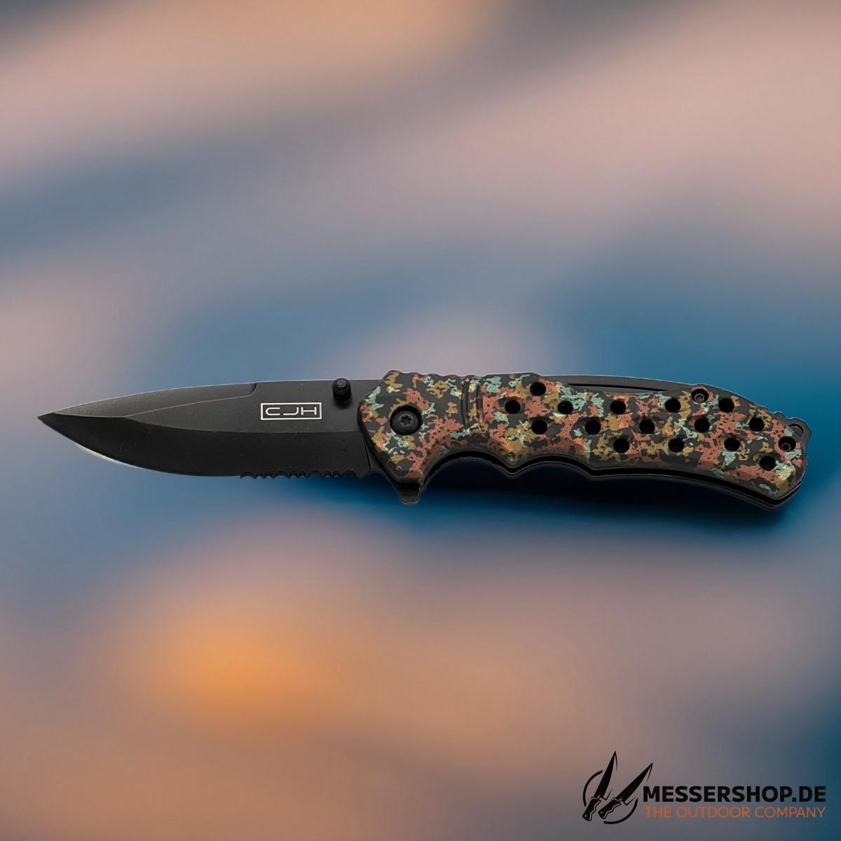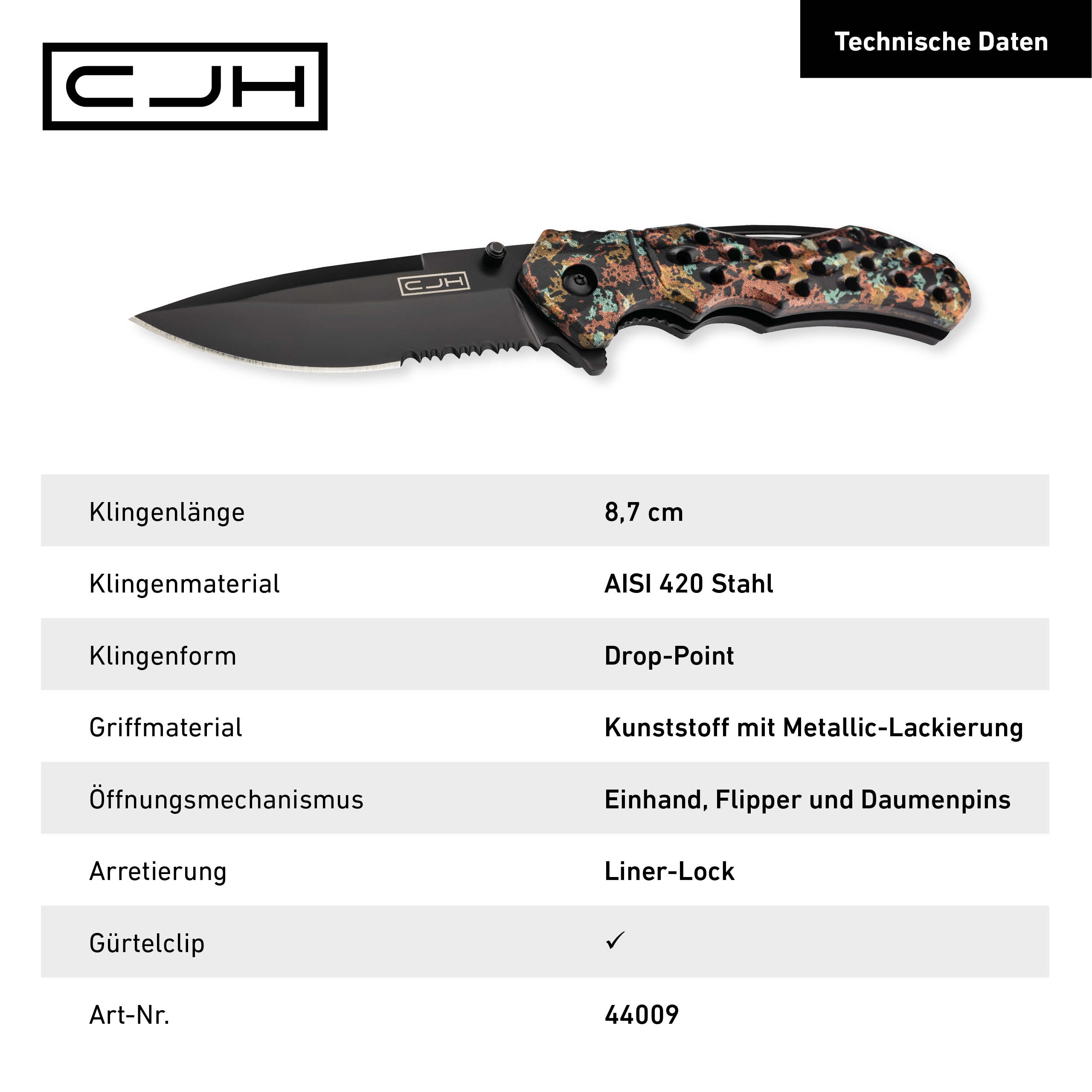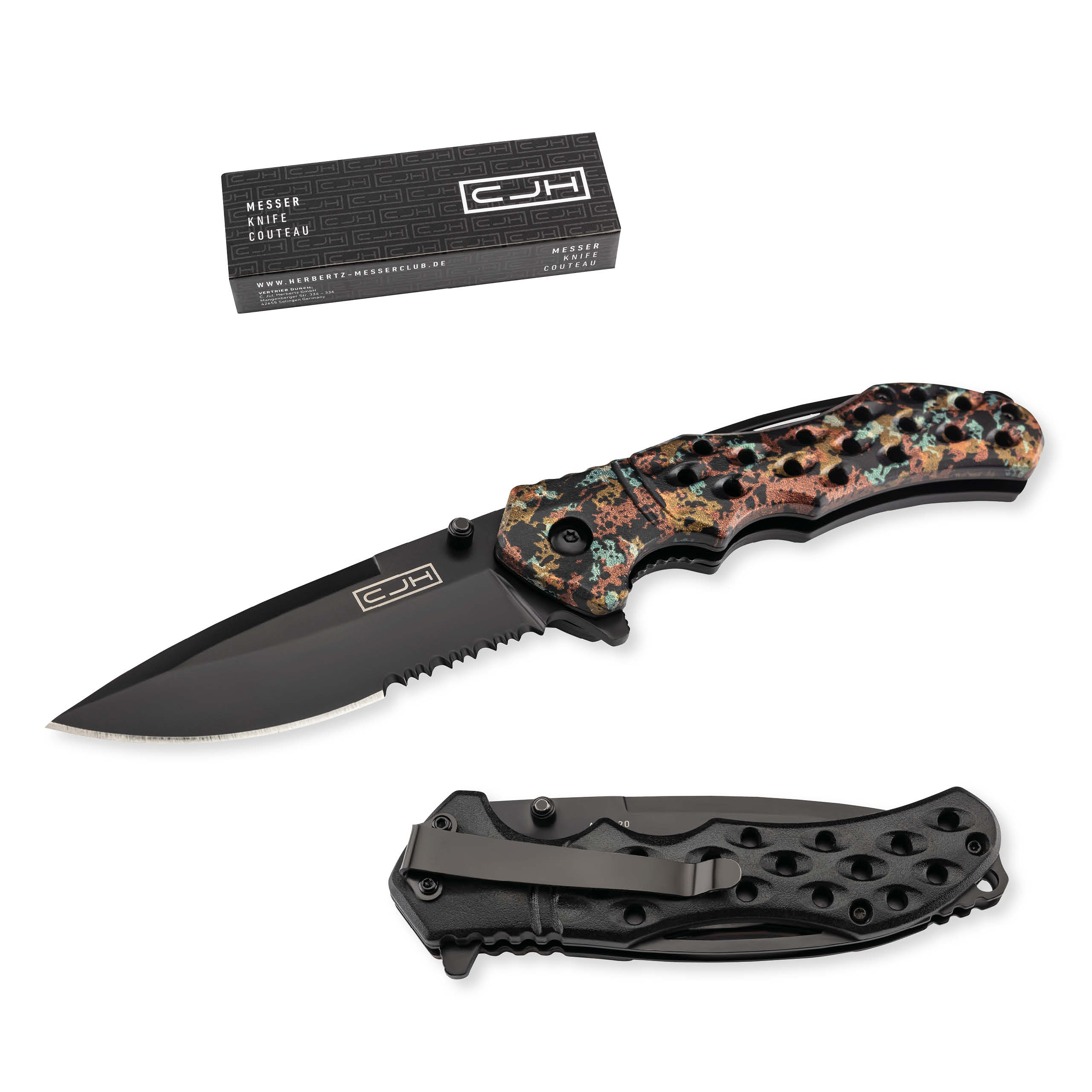 Das Einhandmesser aus der CJH Serie von Herbertz ist mit einer schwarz beschichteten Klinge aus rostfreiem AISI 420 Stahl ausgestattet und verfügt über eine praktische Teilsägezahnung. Beidseitige Daumenpins oder einem Flipper ermöglichen das Öffnen der Klinge mit nur einer Hand. Durch einen Liner Lock Mechanismus wird die Klinge zuverlässig arretiert. Der ergonomisch geformte Griff liegt dank ausgeprägter Fingermulden sicher in der Hand. Die Heftschalen aus schwarzem ABS Kunststoff sind auf der Frontseite mit einer interessanten Metalliclackierung versehen. Eine Fangriemenöse und ein schwarzer Tip Down Taschenclip vervollständigen die Ausstattung.