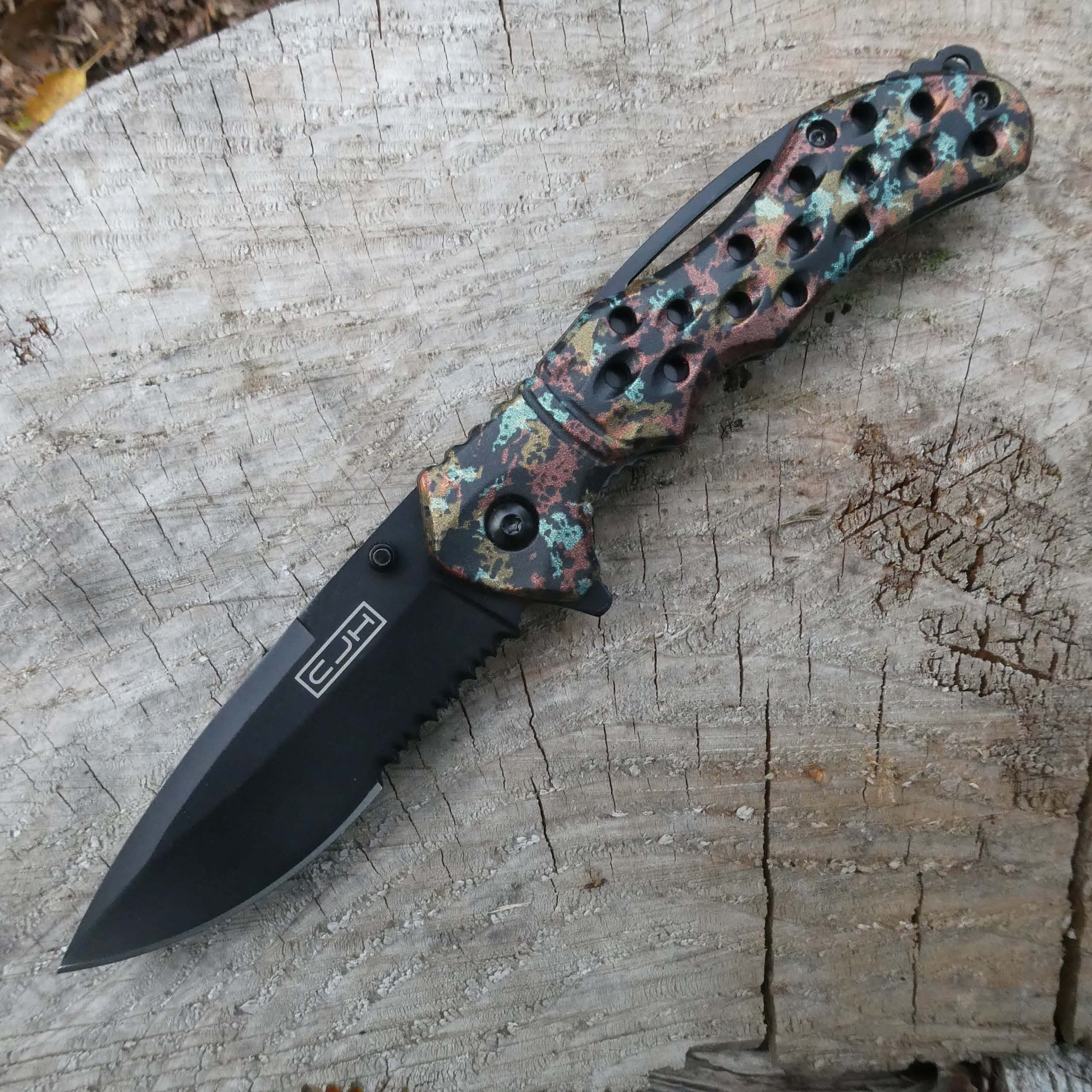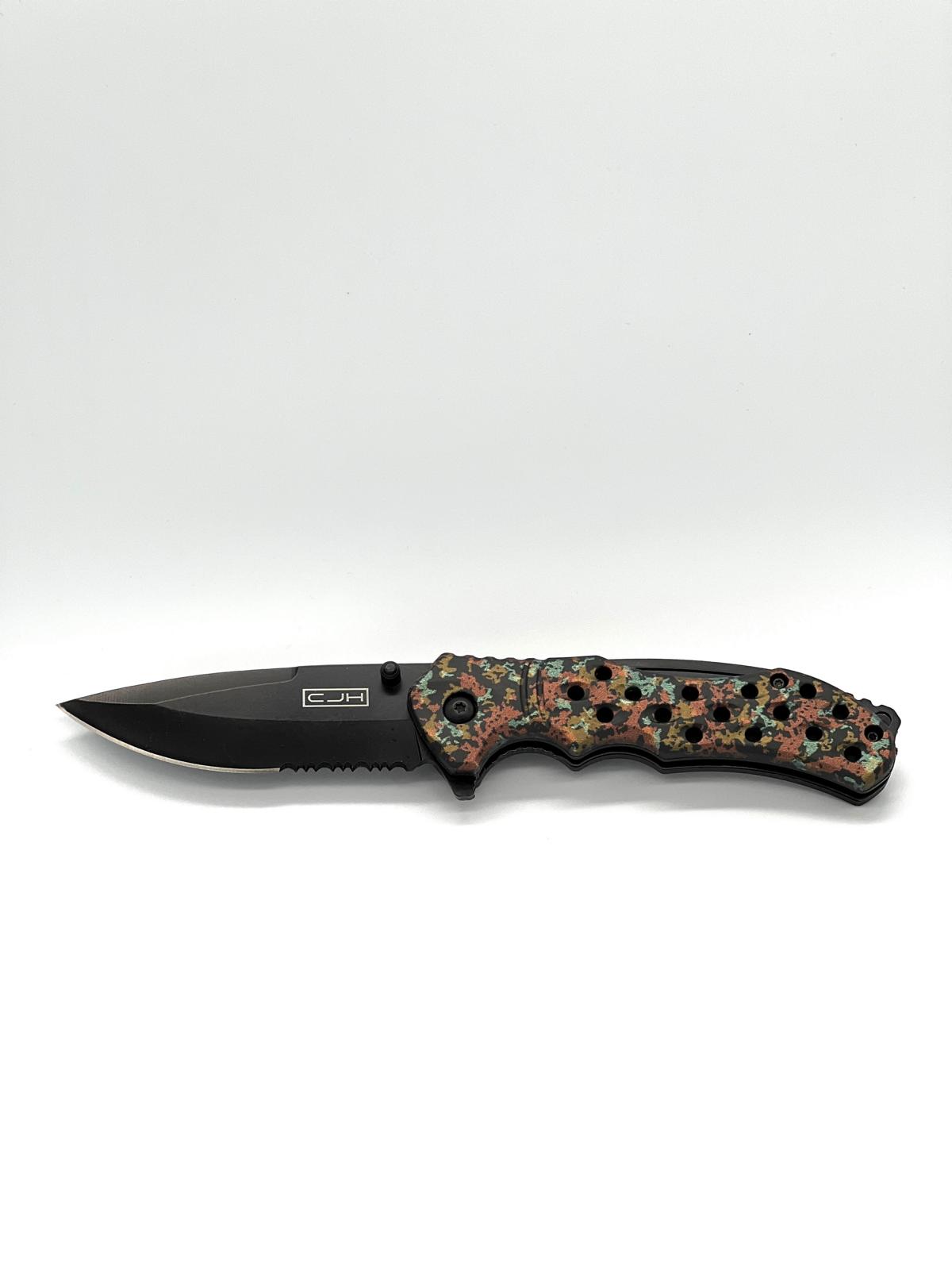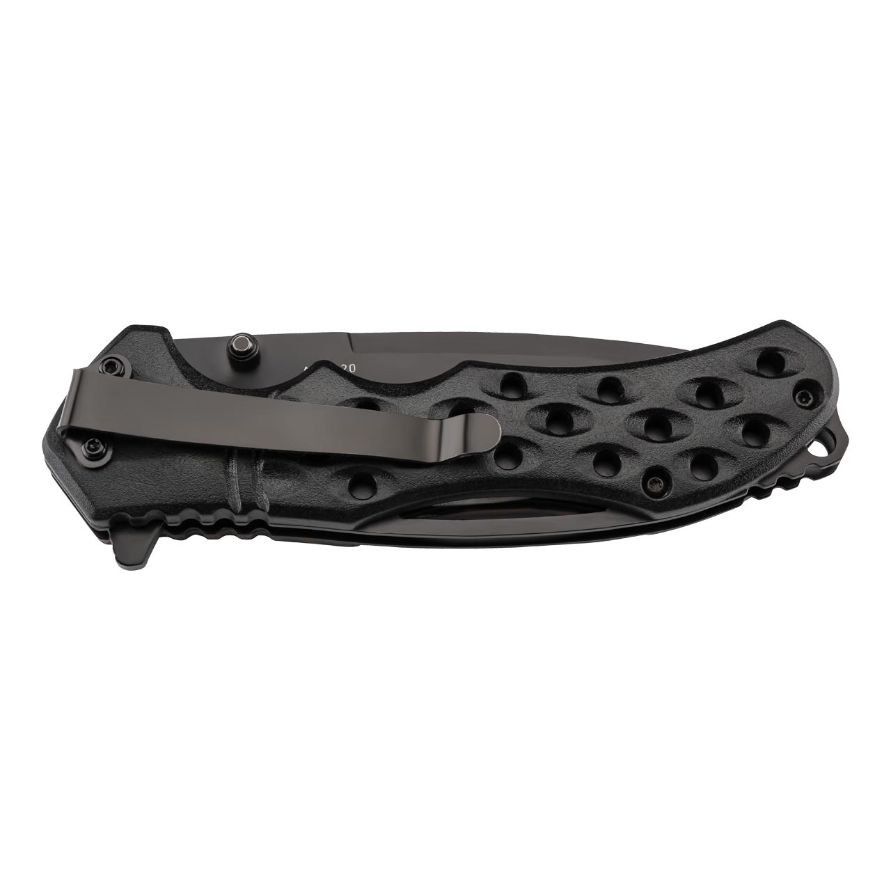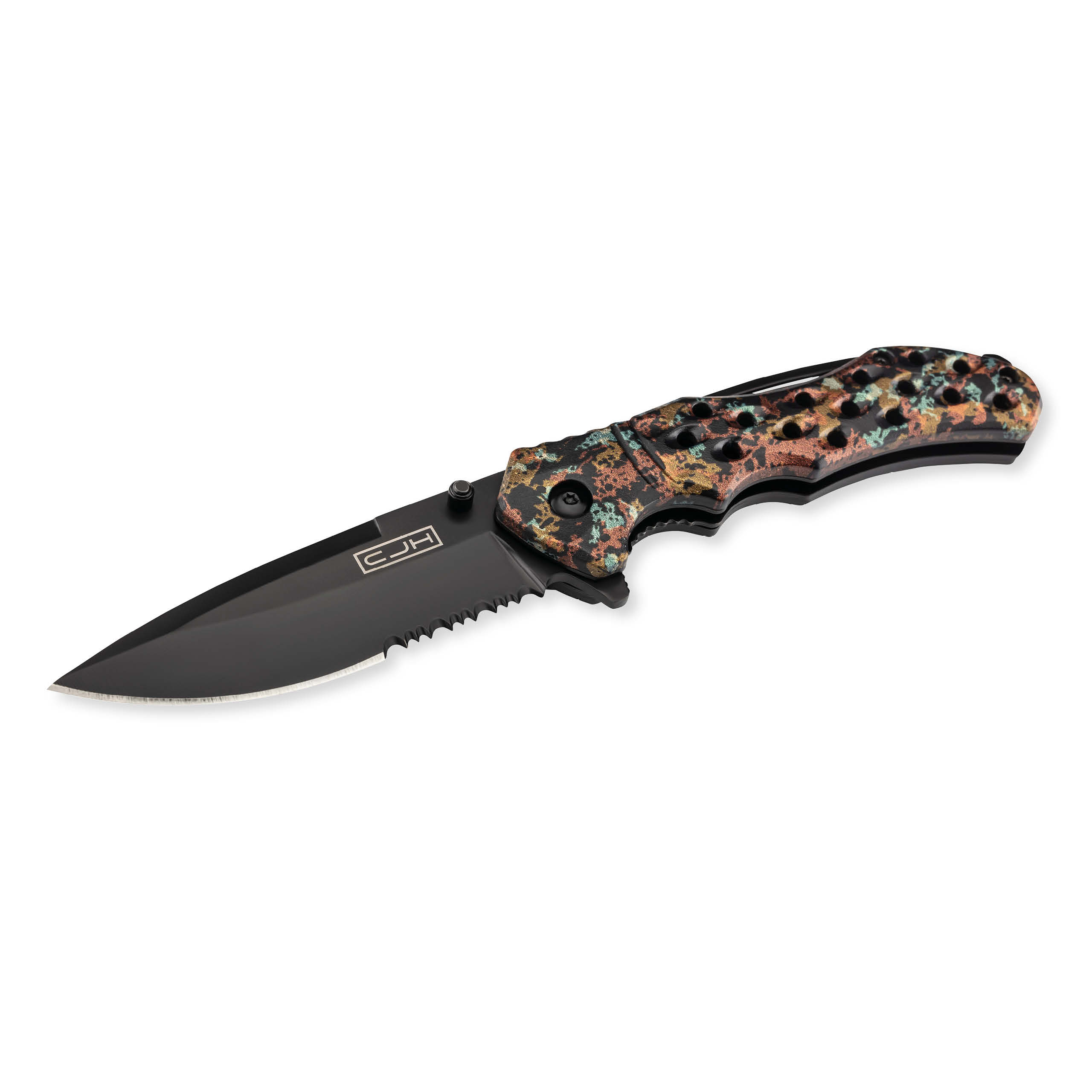Das Einhandmesser aus der CJH Serie von Herbertz ist mit einer schwarz beschichteten Klinge aus rostfreiem AISI 420 Stahl ausgestattet und verfügt über eine praktische Teilsägezahnung. Beidseitige Daumenpins oder einem Flipper ermöglichen das Öffnen der Klinge mit nur einer Hand. Durch einen Liner Lock Mechanismus wird die Klinge zuverlässig arretiert. Der ergonomisch geformte Griff liegt dank ausgeprägter Fingermulden sicher in der Hand. Die Heftschalen aus schwarzem ABS Kunststoff sind auf der Frontseite mit einer interessanten Metalliclackierung versehen. Eine Fangriemenöse und ein schwarzer Tip Down Taschenclip vervollständigen die Ausstattung.