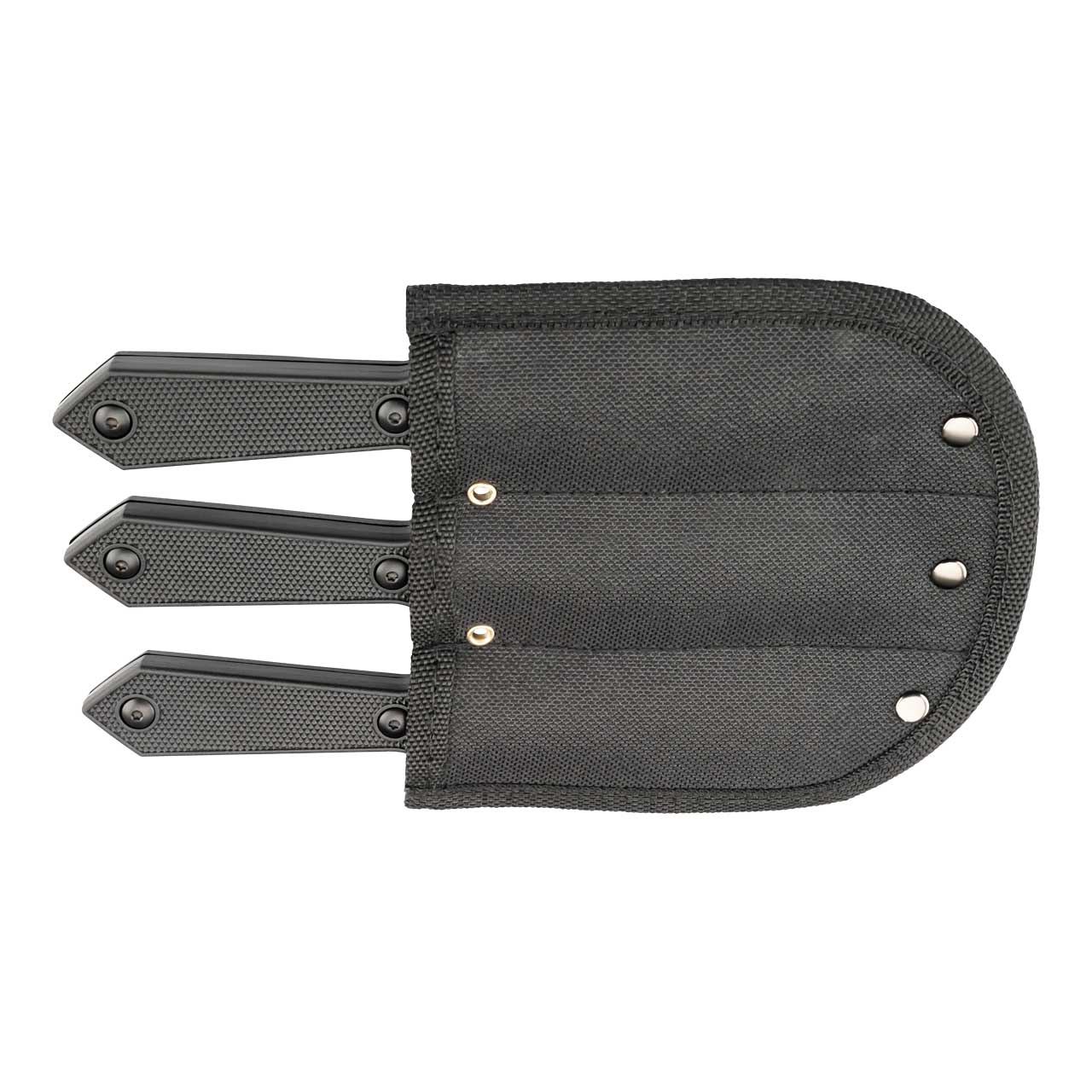 Dieses Wurfmesser-Set aus der CJH Serie von Herbertz beinhaltet drei rostfreie, schwarz beschichtete Full Tang Messer aus zähem AISI 420 Stahl. Aufgrund Ihrer schlanken Ausführung und den Klingendurchbrüchen sind die Messer angenehm leicht. Die Oberflächenstruktur der schwarzen Kunststoffgriffschalen sorgt für eine sichere Handlage. In der mitgelieferten Nylonscheide finden alle Wurfmesser Ihren Platz. Verkauf nur an Personen ab 18 Jahren.