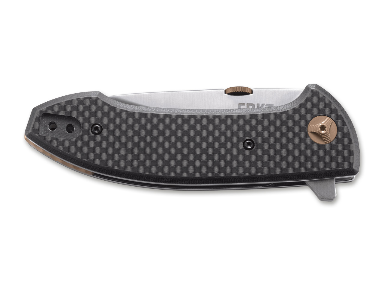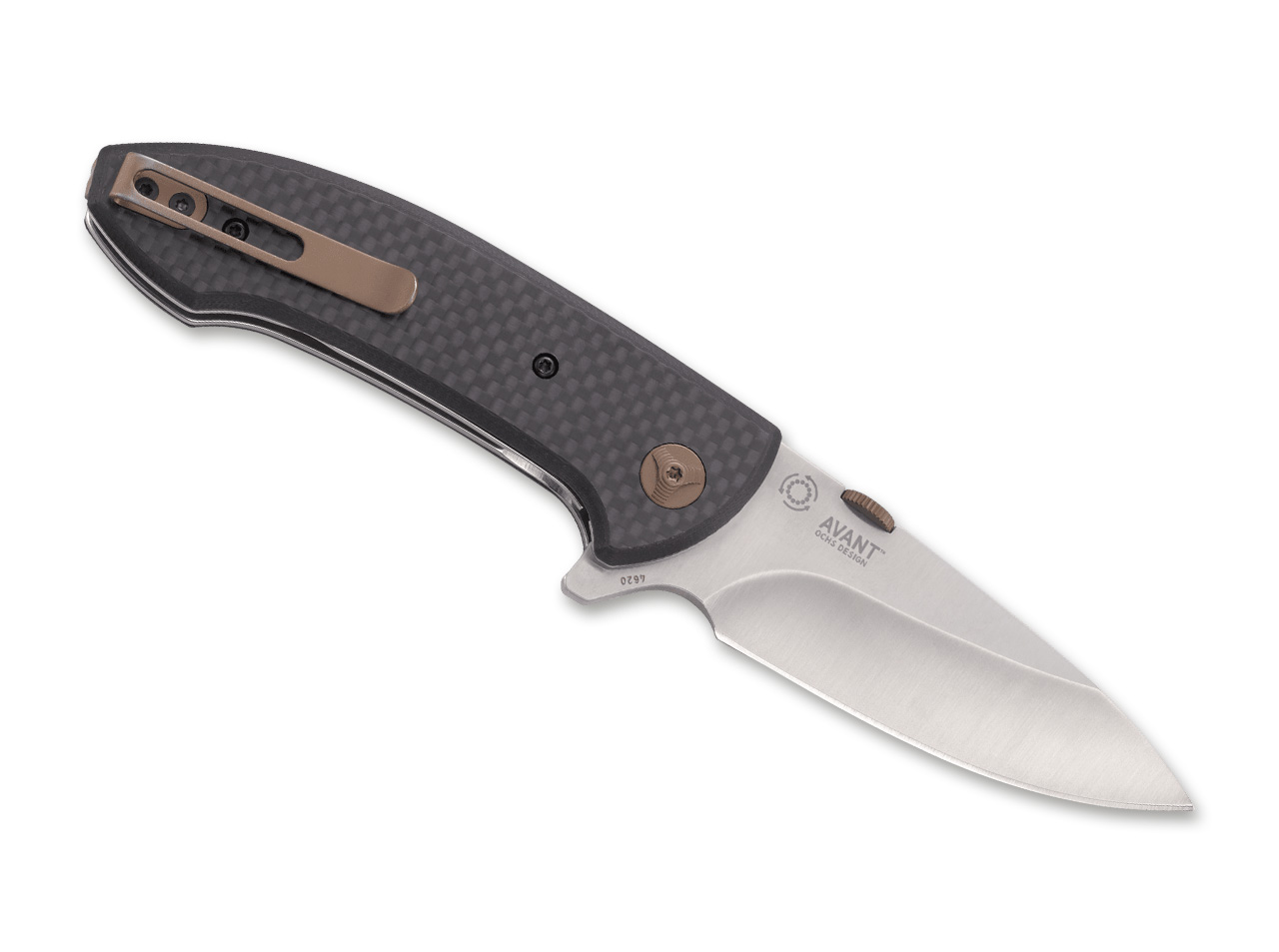 Das CRKT Avant von Eric Ochs aus Oregon ist wieder einmal ein Paradebeispiel dafür, wie gut ein minimalistisches Design ohne Schnörkel oder Schnickschnack funktioniert. Der sanft gerundete Griff des Taschenmessers liegt ausgezeichnet in der Hand, und die Öffnung der kugelgelagerten Klinge per Flipper oder Daumenscheibe ist ebenso praxisgerecht wie der umsetzbare Clip. Bronzefarbene Akzente setzen Clip, Klingenlager und die Daumenscheibe und erzeugen gemeinsam mit der Beschalung aus Kohlefaser ein edles Erscheinungsbild, das dennoch eher von Understatement zeugt. Gesichert wird die Klinge durch einen Linerlock. Mit umsetzbarem Clip (Tip-up/l-r).