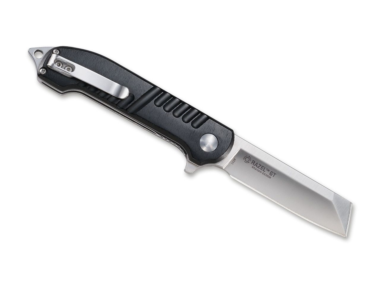 Jon Graham zündet mit dem CRKT Razel GT den Turbo und stattet das Messer mit einer umfangreichen Ausstattung aus. Die Meißel artige Klinge aus 8Cr13MoV eignet sich für vielseitige Aufgaben und ist mit einem Satin-Finish versehen. Der Griff aus Aluminium ist äußerst robust und liegt sicher in der Hand. Der federunterstützte Flipper öffnet das Messer und verriegelt die Klinge mit dem sicheren Linerlock. Die Fangriemenöse kann bei Bedarf als Glasbrecher verwendet werden.
