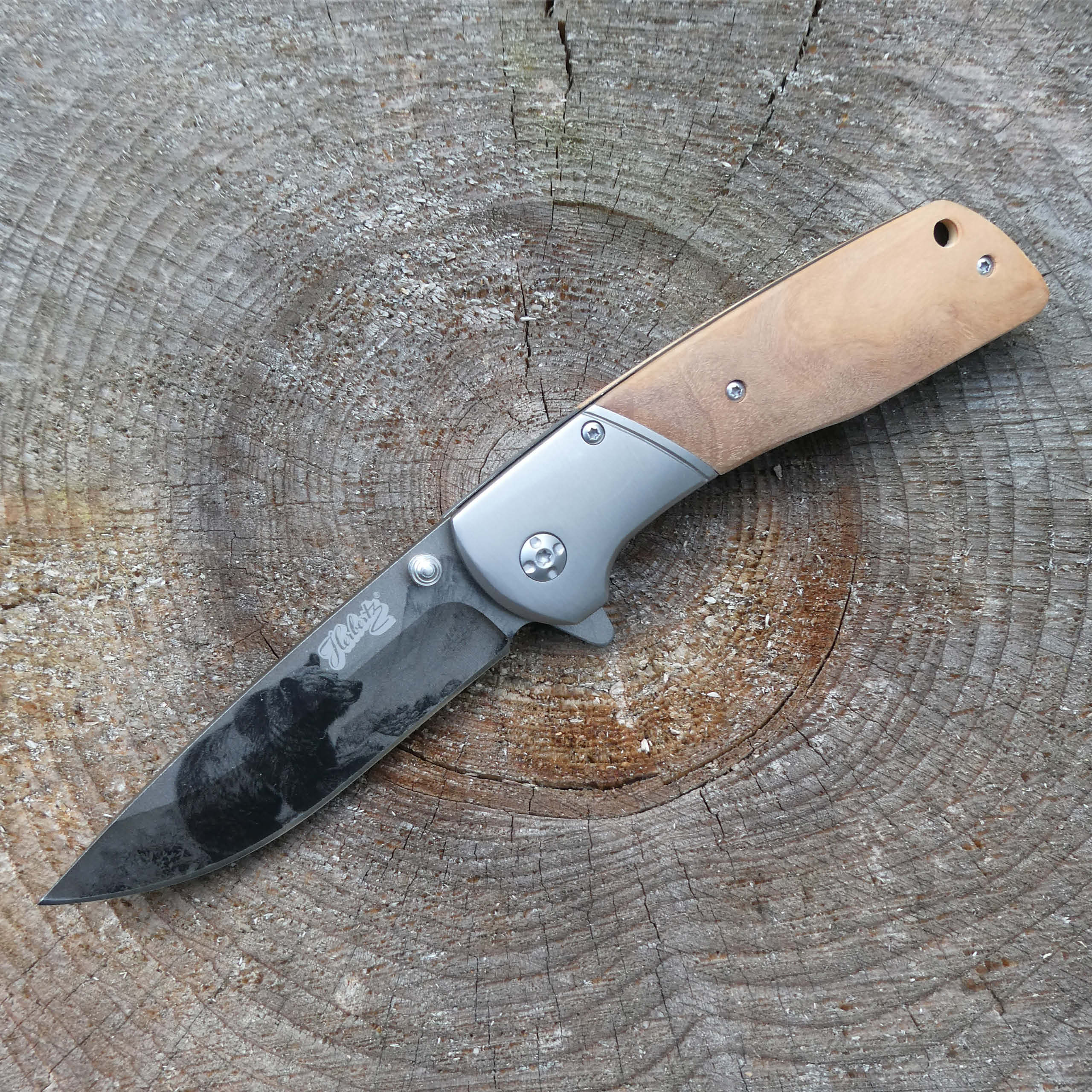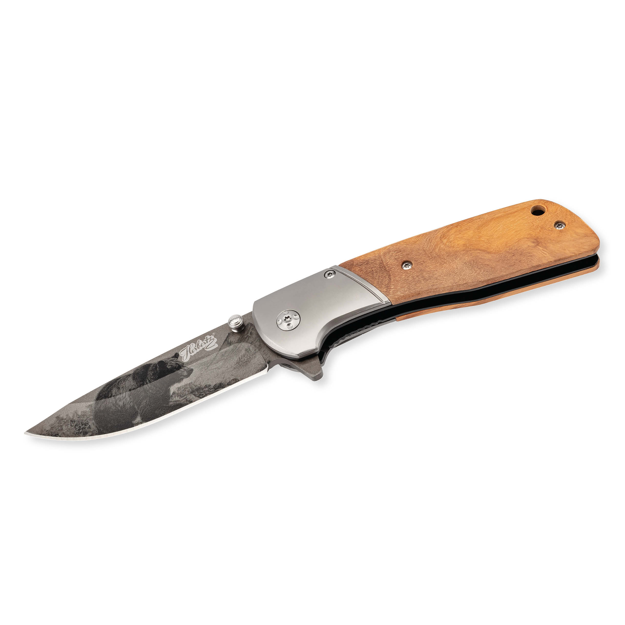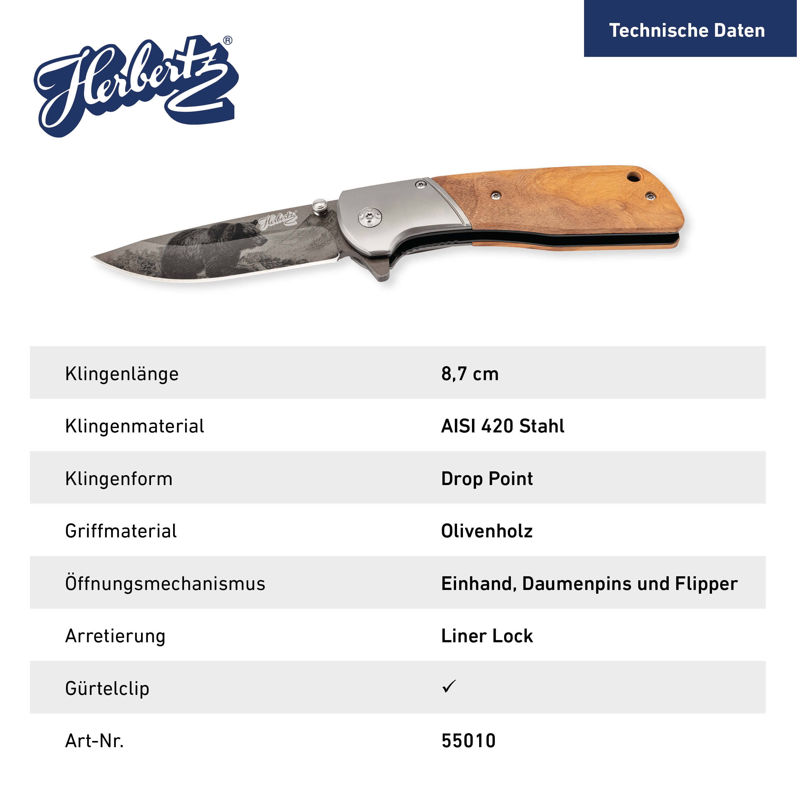 Dieses Einhandmesser aus dem Hause Herbertz ist mit einer titanbeschichteten Drop Point Klinge aus rostfreiem AISI 420 Stahl ausgestattet. Vorder- und Rückseite sind mit einem detaillierten Bärenmotiv in 3D Drucktechnik versehen. Ein reibungsloses und effizientes Öffnen mit nur einer Hand wird durch die kugelgelagerte Klingenachse, einen Flipper, oder beidseitige Daumenpins ermöglicht. Der Liner Lock Mechanismus sorgt für eine sichere Arretierung der Klinge. Die Heftschalen sind aus Olivenholz gefertigt und bilden in Kombination mit den titanbeschichteten Edelstahlbacken ein attraktives Design. Eine Fangriemenöse und ein ebenfalls titanbeschichteter Tip Down Taschenclip runden die Ausstattung ab.