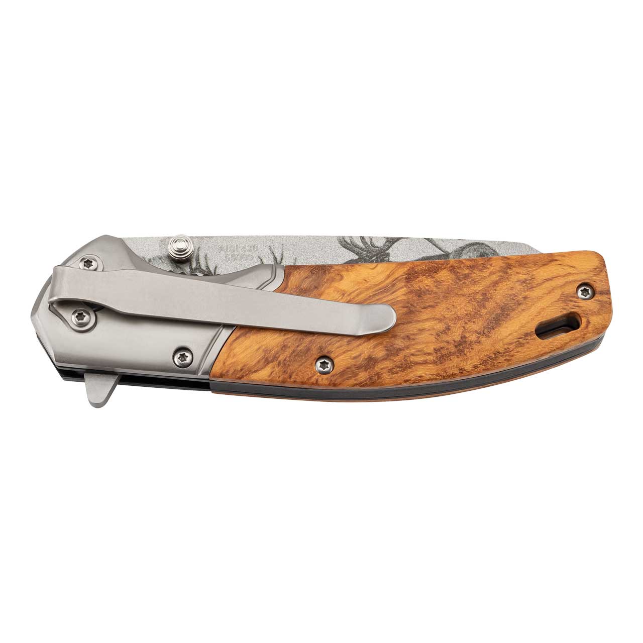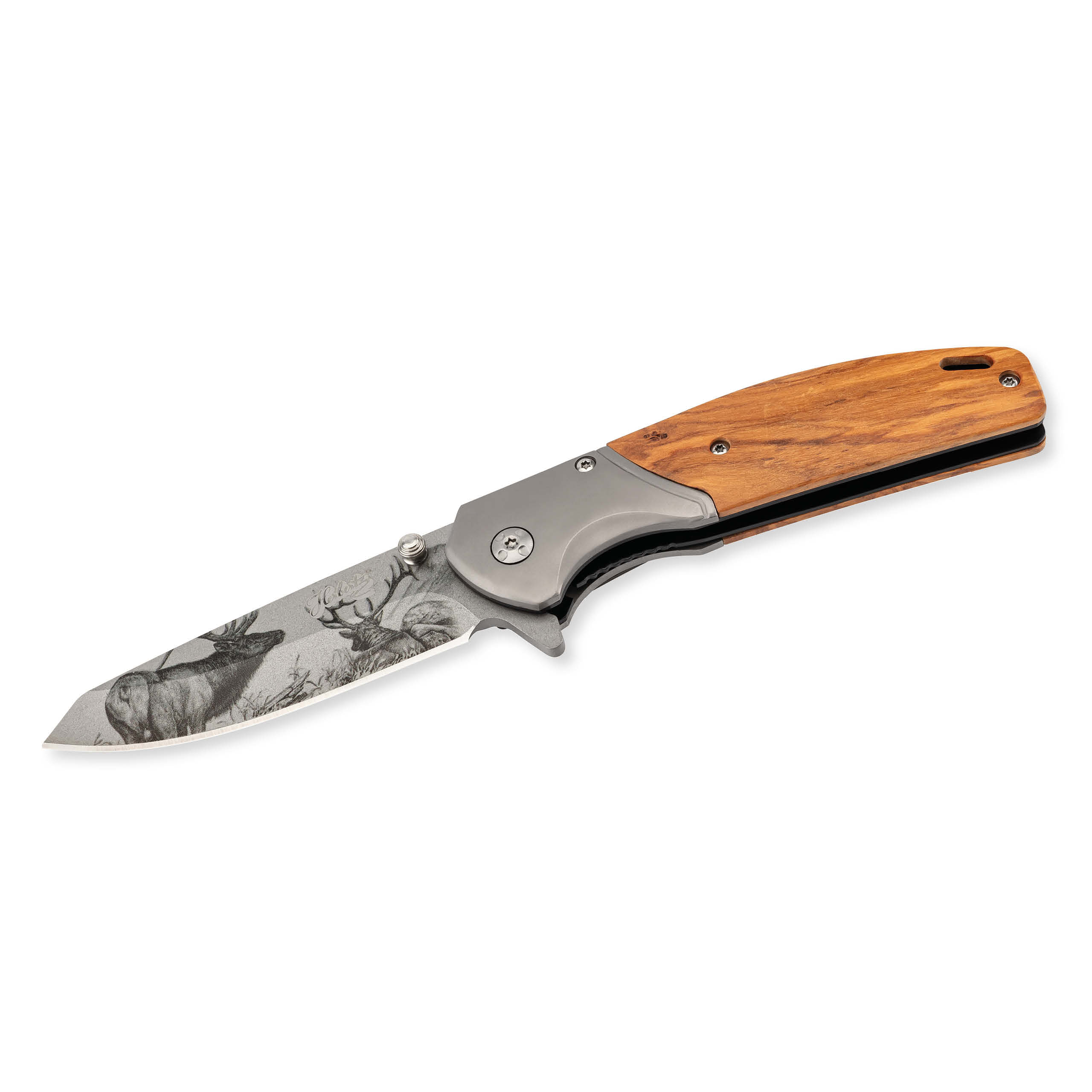 Dieses Einhandmesser aus dem Hause Herbertz ist mit einer titanbeschichteten Drop Point Klinge aus rostfreiem AISI 420 Stahl ausgestattet. Vorder- und Rückseite sind mit einem detaillierten Hirschmotiv in 3D Drucktechnik versehen. Ein reibungsloses und effizientes Öffnen mit nur einer Hand wird durch die kugelgelagerte Klingenachse, einen Flipper, oder beidseitige Daumenpins ermöglicht. Der Liner Lock Mechanismus sorgt für eine sichere Arretierung der Klinge. Die Heftschalen sind aus Olivenholz gefertigt und bilden in Kombination mit den titanbeschichteten Edelstahlbacken ein attraktives Design. Eine Fangriemenöse und ein ebenfalls titanbeschichteter Tip Down Taschenclip runden die Ausstattung ab.