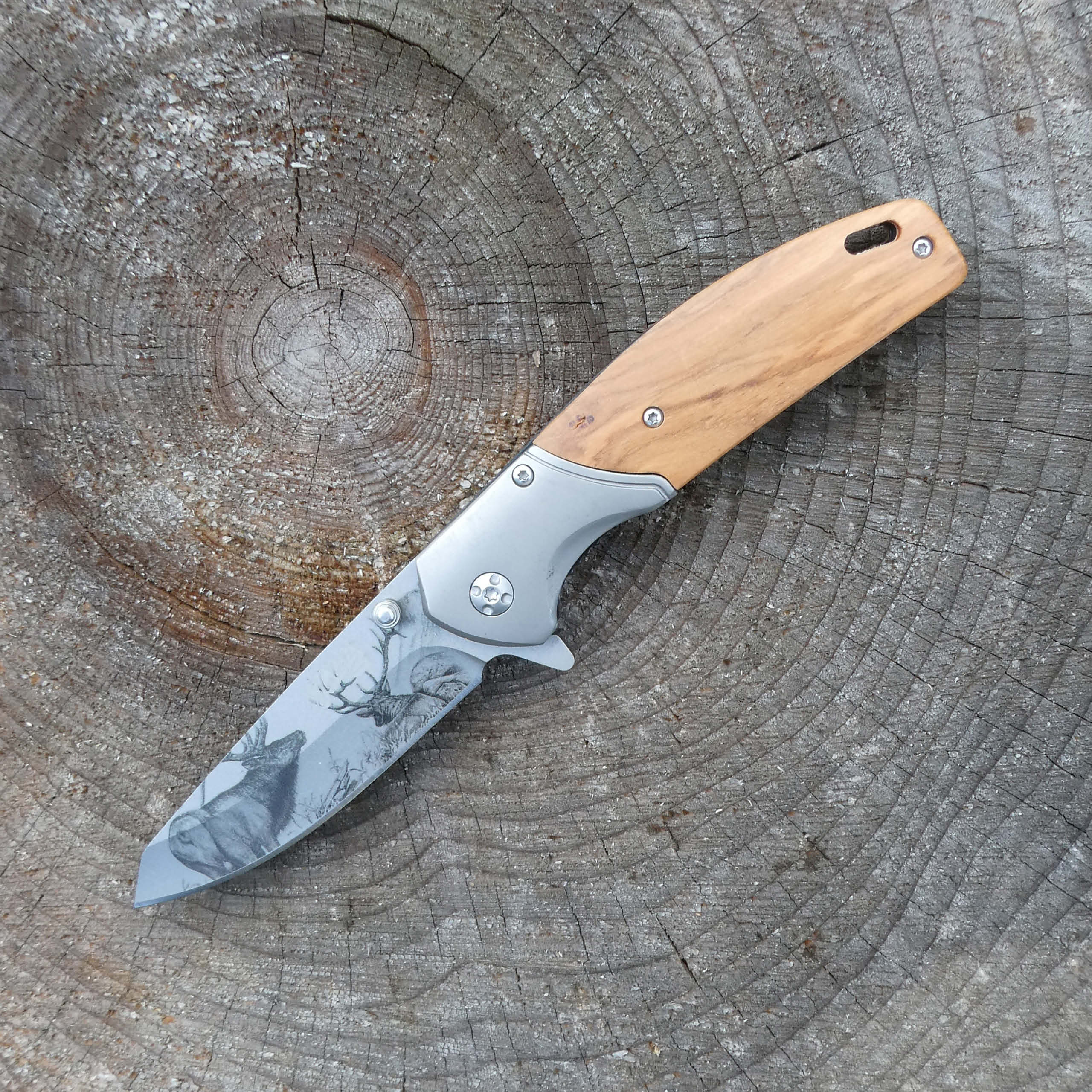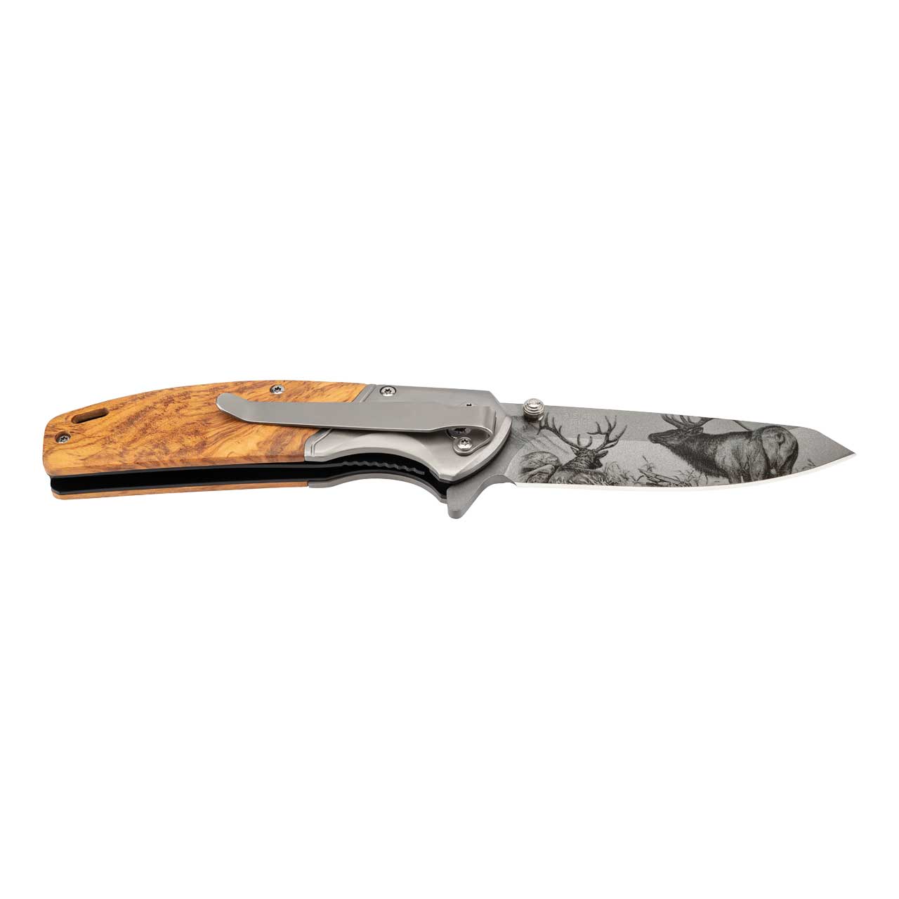 Produktinformationen "Einhandmesser Olivenholz, Hirschmotiv"