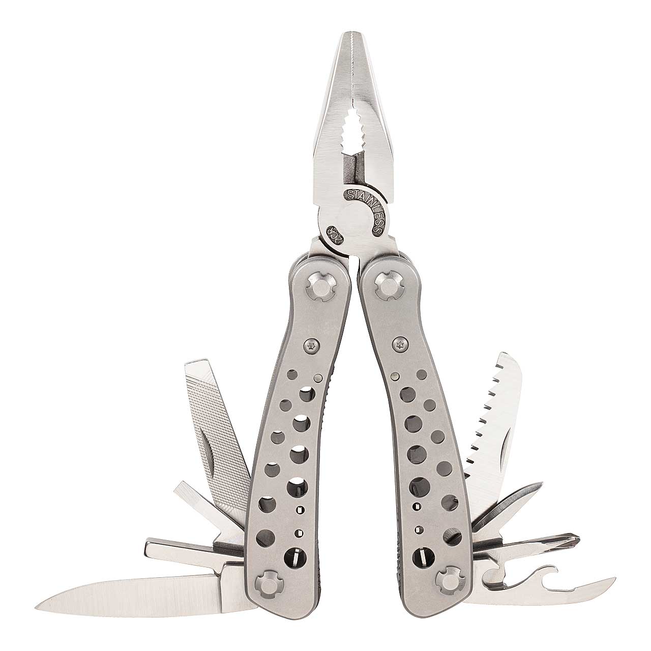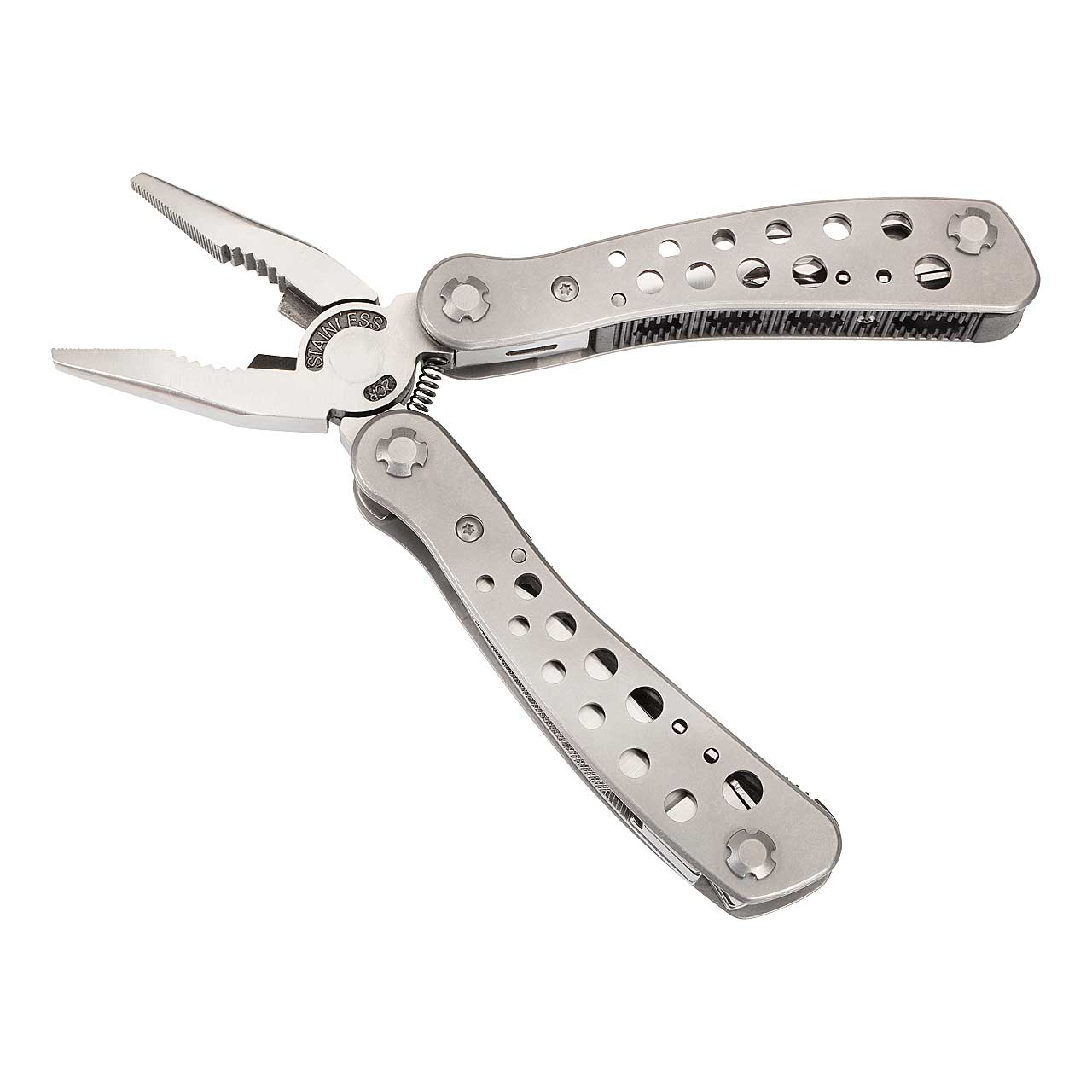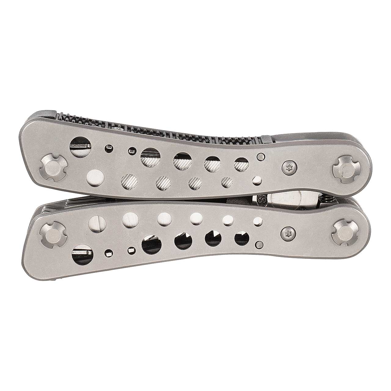 Eine breite Palette an Werkzeugen bietet dieses preiswerte Multitool aus dem Hause Herbertz. Zu dem 9-teiligen Tool gehören neben der Zange auch Klinge, Säge, Schraubendreher, Kapselheber, diverse Schraubendreher und weitere Funktionen. Alle Werkzeuge sind innen liegend und ebenso wie das matte Edelstahl-Gehäuse komplett rostfrei. Mit Bitsatz und Nylonscheide.