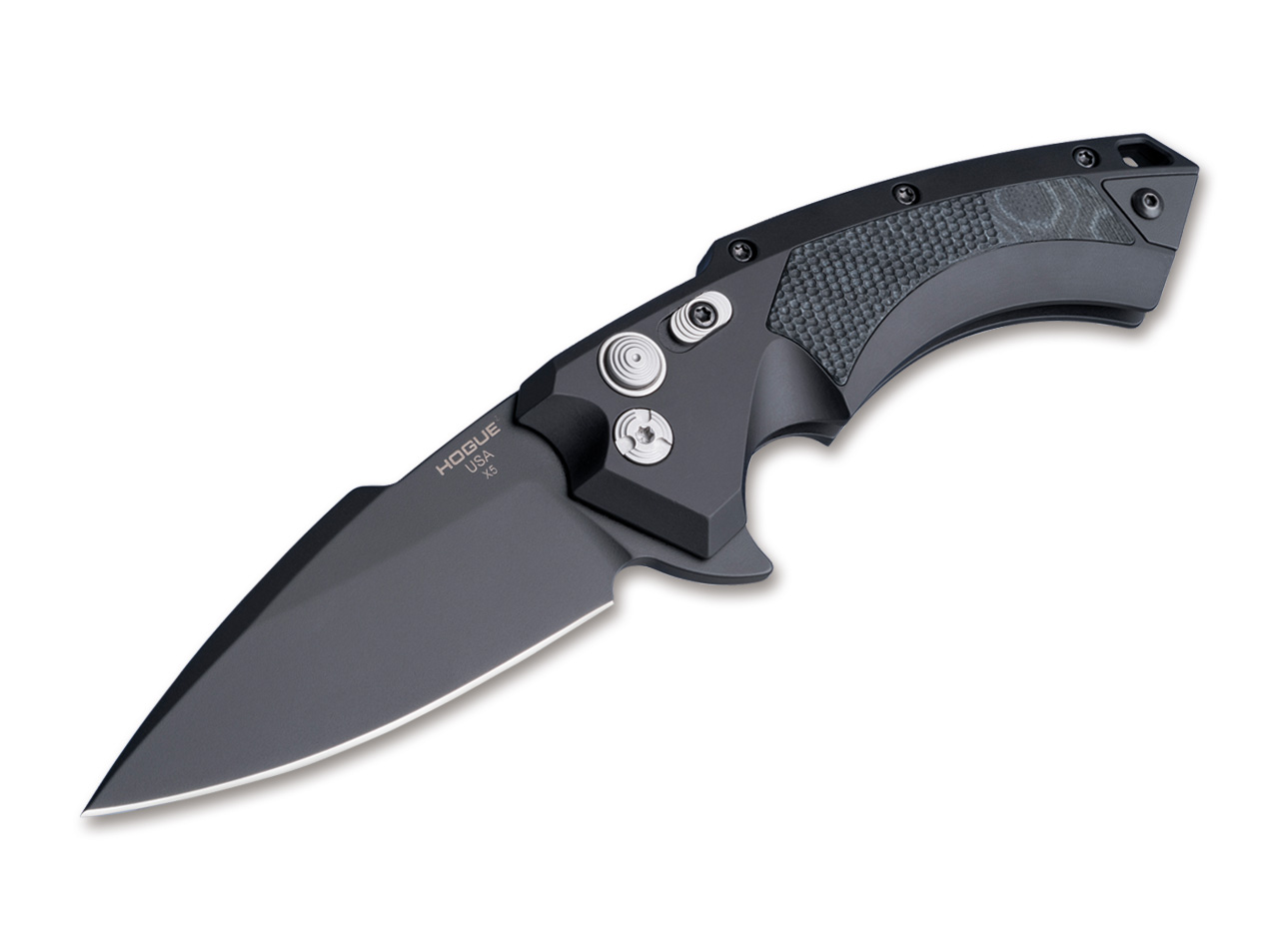 Ein echter Hingucker ist zweifellos das Hogue X5. Die futuristische Formgebung des Aluminiumgriffes geht bei beiden Größen einher mit einer perfekten Ergonomie mit hoher Griffsicherheit. Die Klinge mit Flipper ist aus dem pulvermetallurgischen CPM-154 gefertigt und verriegelt per Druckknopf, mit zusätzlicher Schiebesicherung. Ein Allrounder, der sich in keiner Einsatzlage eine Blöße gibt. Mit umsetzbarem Deep-Carry-Clip (Tip-up/l-r) und Fangriemenöse. Die Klinge ist beim X5 3.5 Cerakote-beschichtet. Alugriff (6061-T6) mit G-Mascus-Einlage.