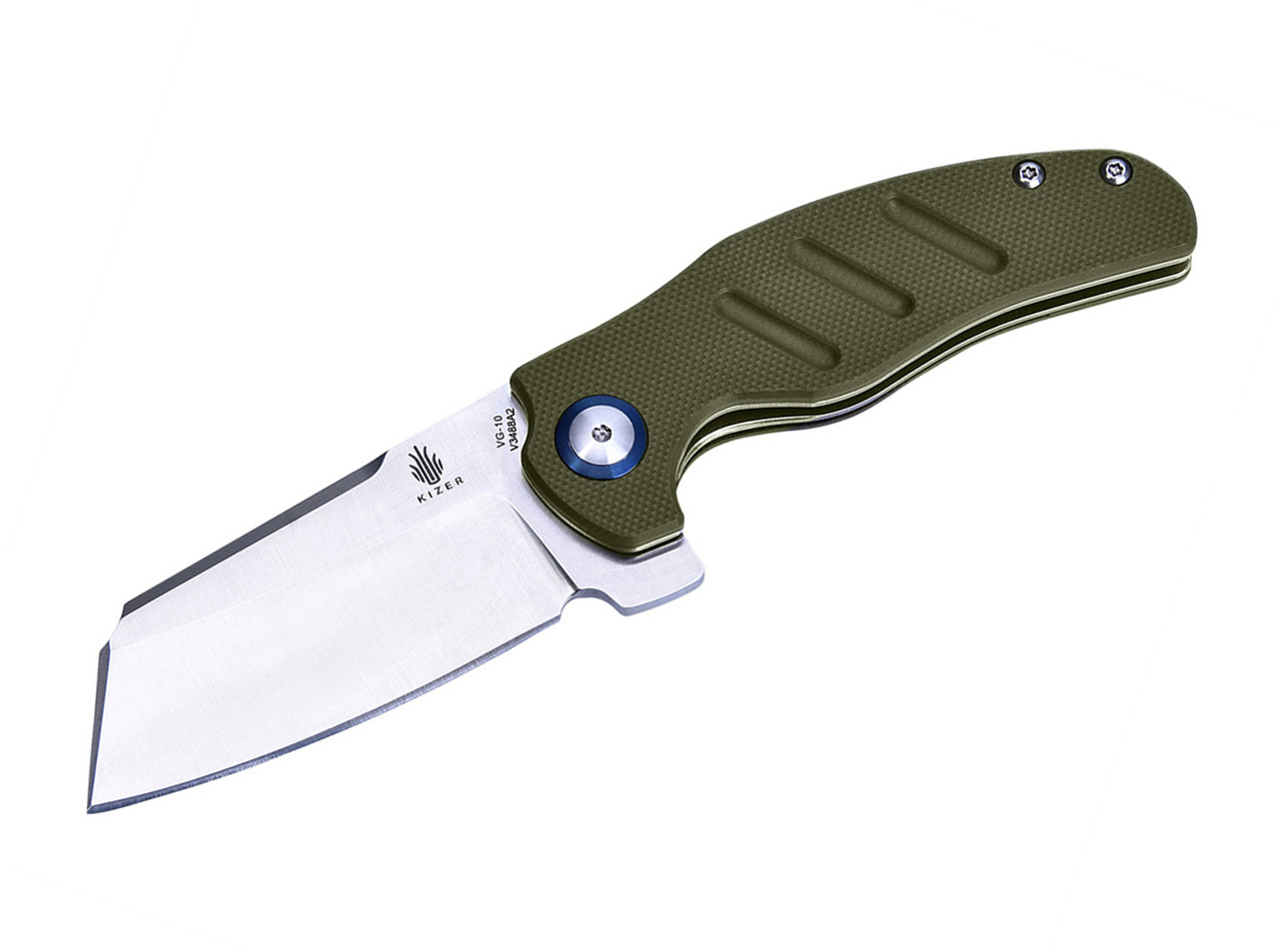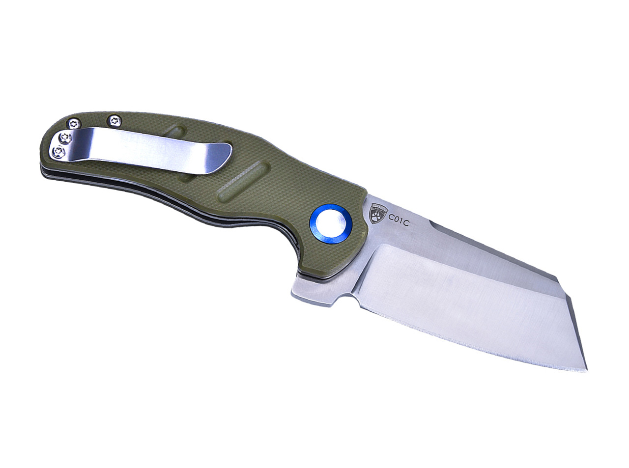 Das Kizer Mini Sheepdog C01C besitzt eine schwere beilartige Klinge von Chris Conaway von Sheepdoog Knives. Die große Sheepfoot-Klinge wird aus 154CM gefertigt und ist mit einem Two-Tone Finish versehen. Die wuchtige Klinge lässt sich dank des Flippers leichtgängig und sanft öffnen, verriegelt wird sie durch einen Linerlock. Die konturierten grünen G10-Griffschalen bieten komfortablen Grip. Dieses Messer bietet eine bemerkenswerte Kombination aus taktischer Funktionalität und einem modernen Erscheinungsbild. Mit abnehmbarem Clip (Tip-up).