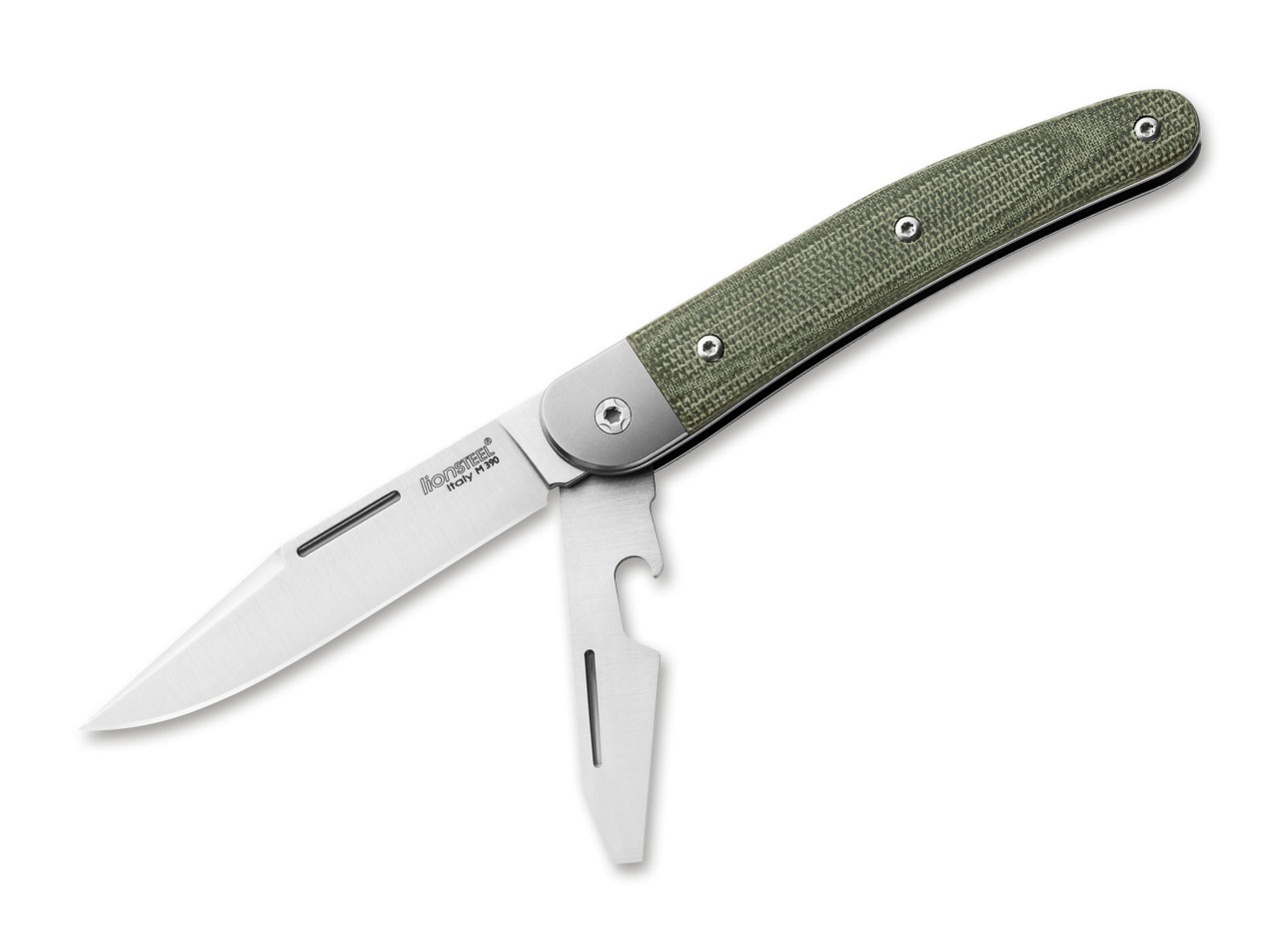 Das Jack Two ist LionSteels moderne Interpretation eines klassischen Slipjoint-Messers. Die Symbiose aus modernen Materialien mit klassischer Technik macht das Jack Two zu einem zeitlosen Alltagsmesser. Geöffnet wird die schnitthaltige Clippoint-Klinge aus M390 via Nagelhau, während der Griff aus grünem Micarta dem Messer den nötigen Halt verspricht. Die zweite Klinge enthält einen praktischen Schlitz-Schraubendreher sowie einen Kapselheber. Liner und Backen sind aus edlem Titan gefertigt.