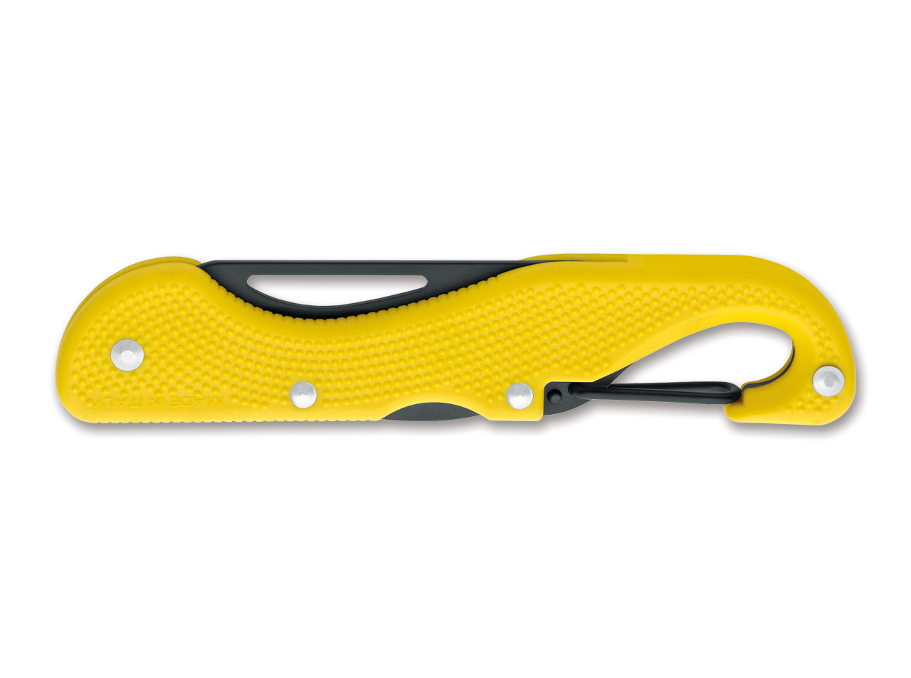 Leichtes Rettungsmesser mit gelben Griffschalen und Meißelklinge aus 4034 mit Wellenschliff.