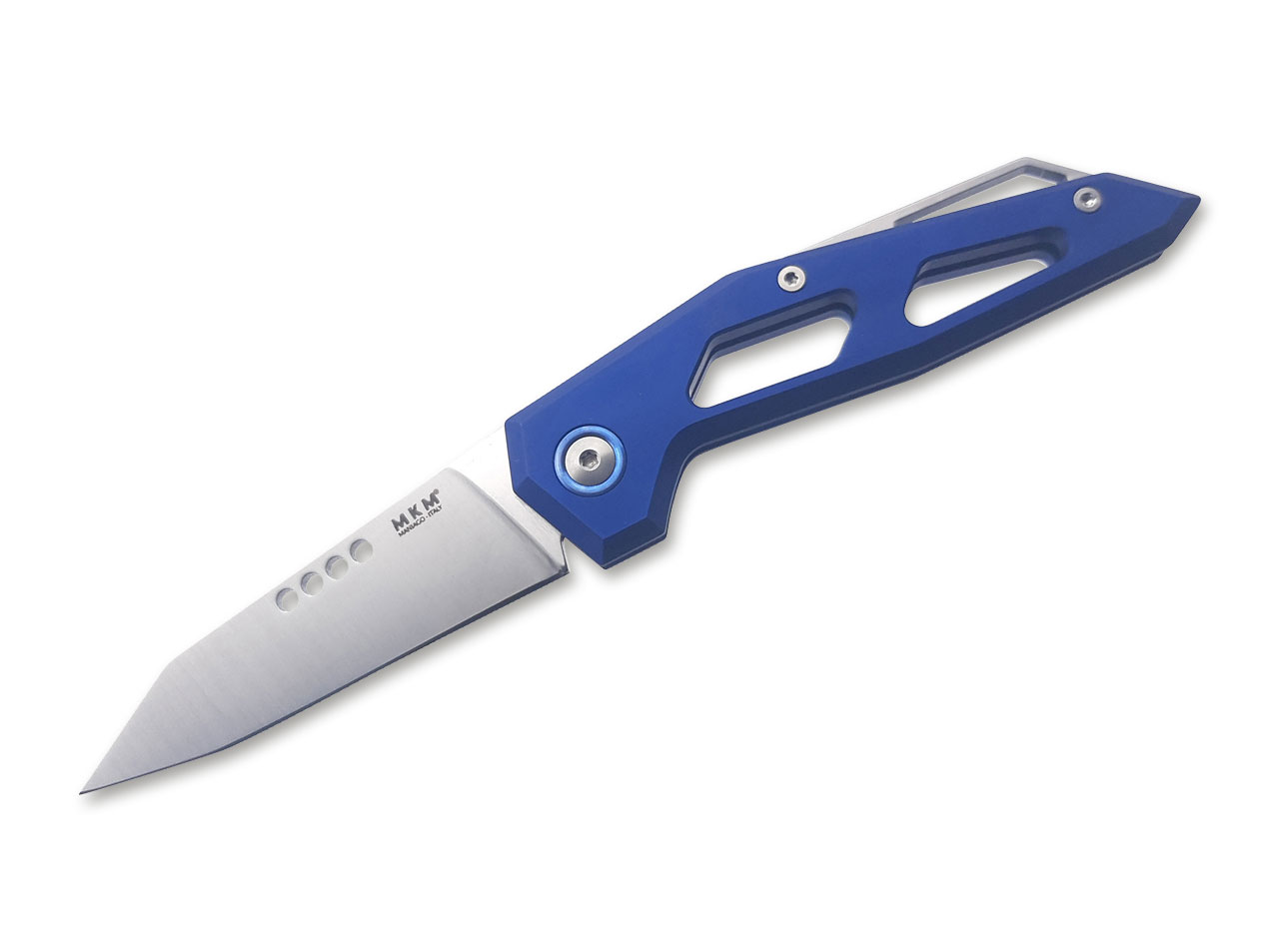 Das MKM Edge Aluminium Blue balanciert gekonnt auf dem schmalen Grat zwischen klassischer Mechanik und avantgardistischer Optik. Das moderne Slipjoint Messer ist mit einer hochwertigen Klinge aus M390 ausgestattet, die mit Hilfe vierer kleiner Daumenöffnungen ausgeklappt wird. Der geradlinige Griff aus blauem Aluminium ist mit großen Aussparungen versehen, die das Gewicht des EDC reduzieren und gleichzeitig guten Halt versprechen. Das anodisierte Klingendrehgelenk setzt einen interessanten Farbakzent. Mit Fangriemenöse und hochwertigem Lederetui.