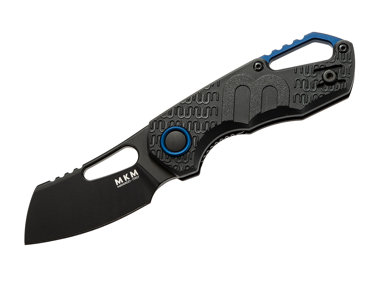 Das MKM Isonzo wurde von Jesper Voxnæs entworfen und positioniert sich klar als handliches, kompaktes Outdoormesser. Dank des blauen Spacers aus Aluminium, der als besonders großzügig dimensionierte Fangriemenöse fungiert, kann das Taschenmesser problemlos mit einem Karabiner an der Ausrüstung befestigt werden und ist so der ideale Begleiter beim Bergsteigen oder Wandern. Die kurze Cleaver-Klinge wird aus N690 gefertigt und ist mit einer widerstandsfähigen schwarzen Beschichtung versehen. Sie wird mit Hilfe der länglichen Daumenöffung geöffnet und durch einen Linerlock gesichert. Der rutschfeste Griff aus schwarzem Kunststoff verfügt über eine strukturierte Oberfläche und liegt dank den ergonomischen Griffmulden auch bei Nässe sicher in der Hand. Mit umsetzbarem Drahtclip (Tip-up/l-r).