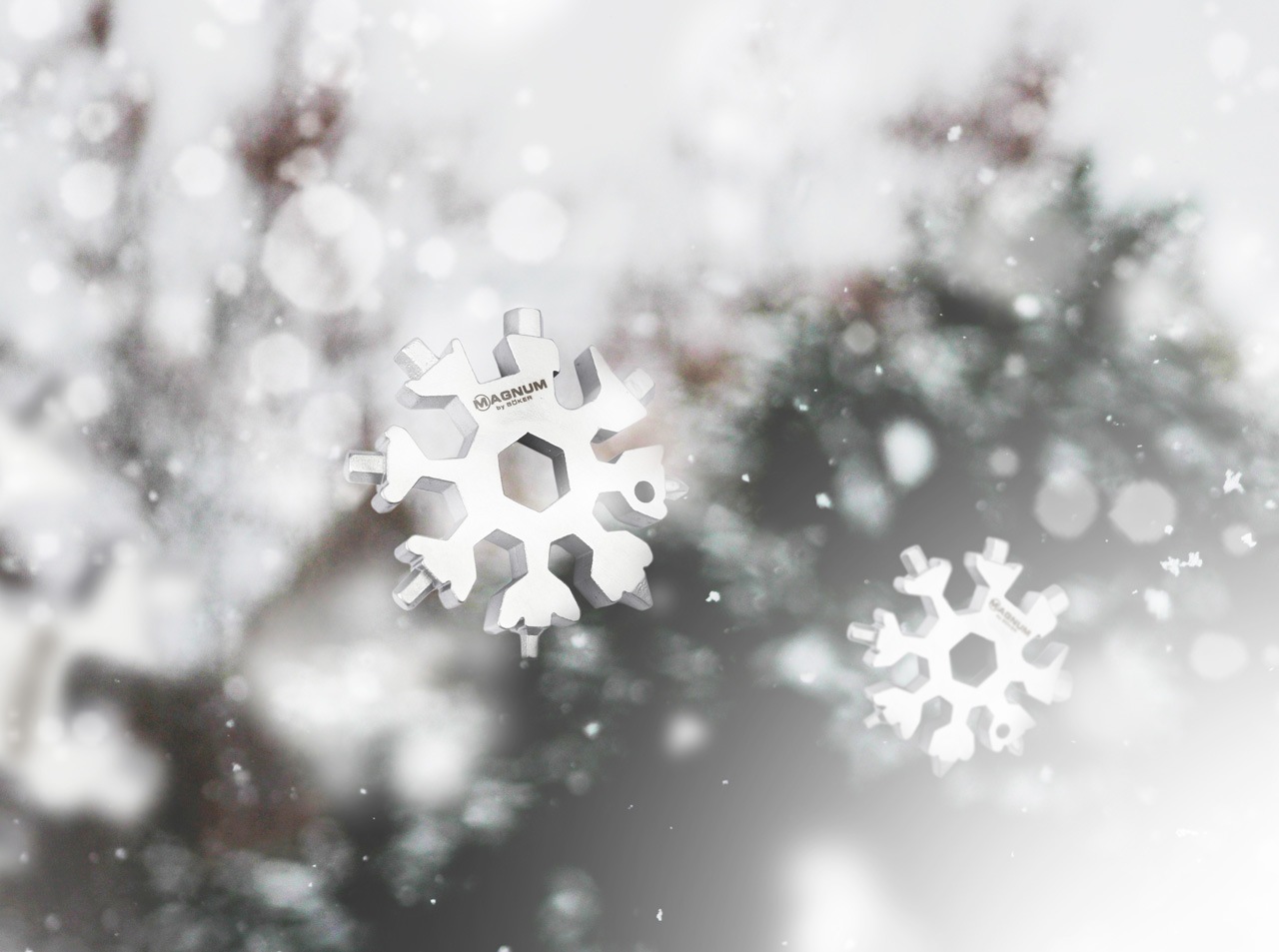 Achtung! Bitte beachten Sie, dass Gratisartikel am Ende der Bestellung im Warenkorb ausgewählt werden müssen und nicht über diese Artikelseite bestellt werden können. Das massive Magnum Snow Crystal Tool ist erst auf den zweiten Blick als praktisches Multitool zu erkennen. Das an eine Schneeflocke erinnernde Werkzeug aus über acht Millimeter starkem Stahl vereint ganze 18 Funktionen auf kleinstem Raum und wird aus rostfreiem 3Cr13 gefertigt. Es ist ausgestattet mit sechs Innensechskantschlüsseln in den Millimeter-Größen 3 / 4 / 5 / 6 / 7 / 8, sieben Außensechskantschlüsseln in den Millimeter-Größen 8 / 9 / 10 / 11 / 12 / 13 / 14 / 16, einem Schlitzschraubendreher und einem Phillips-Schraubendreher, sowie einem Flaschenöffner und einem Drahtabisolierer. Die praktische Fangriemenöse kann zudem auch als Drahtbieger genutzt werden. Scheinbar ganz von selbst ergibt sich durch die verschiedenen Werkzeuge so die mit freudigen Kindheitserinnerungen verbundene Form eines Schneekristalls.