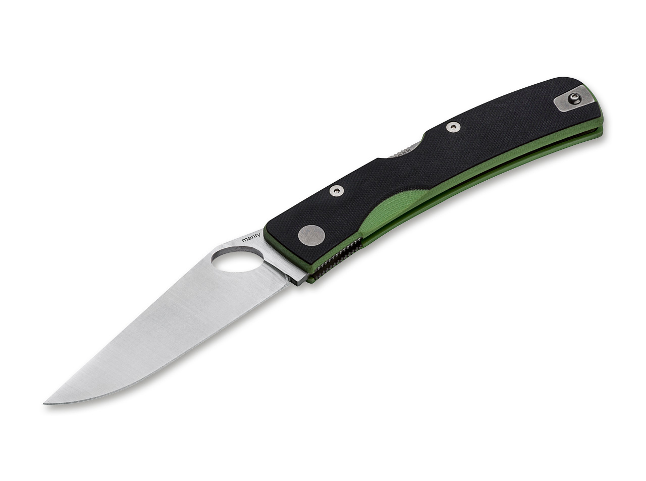 Das Manly Peak ist ein vielfältiges Taschenmesser für den Alltag, das in zahlreichen unterschiedlichen Varianten erhältlich ist. Die satinierte Klinge dieser Ausführung wird aus D2 gefertigt und ist mit einer Daumenöffnung versehen. Die Verriegelung übernimmt ein stabiler Backlock. Die rutschfesten Griffschalen bestehen aus texturiertem zweifarbigen G10 in Schwarz und Grün. Der umsetzbare Clip (Tip-up/l-r) ermöglicht das Tragen für Links- wie auch Rechtshänder.