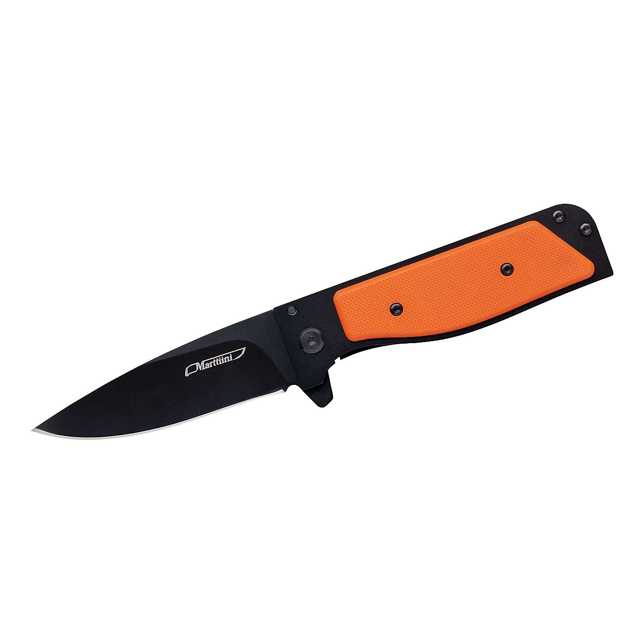 Dieses moderne Einhandmesser aus dem Hause Marttiini legt seinen Fokus auf Handlichkeit und komfortable Größe, wobei das geradlinige Design an einen Vogel erinnern soll. Die schwarz beschichtete Klinge aus rostfreiem 8Cr13MoV Stahl lässt sich dank der kugelgelagerten Klingenachse leicht über einen Flipper in Arbeitsposition bringen. Ein Liner Lock sorgt für eine zuverlässige Arretierung. Schwarze Edelstahlplatinen und auffällige Heftschalen aus orangem G10 bilden den Griff, welcher zusätzlich mit einem Taschenclip ausgestattet wird.