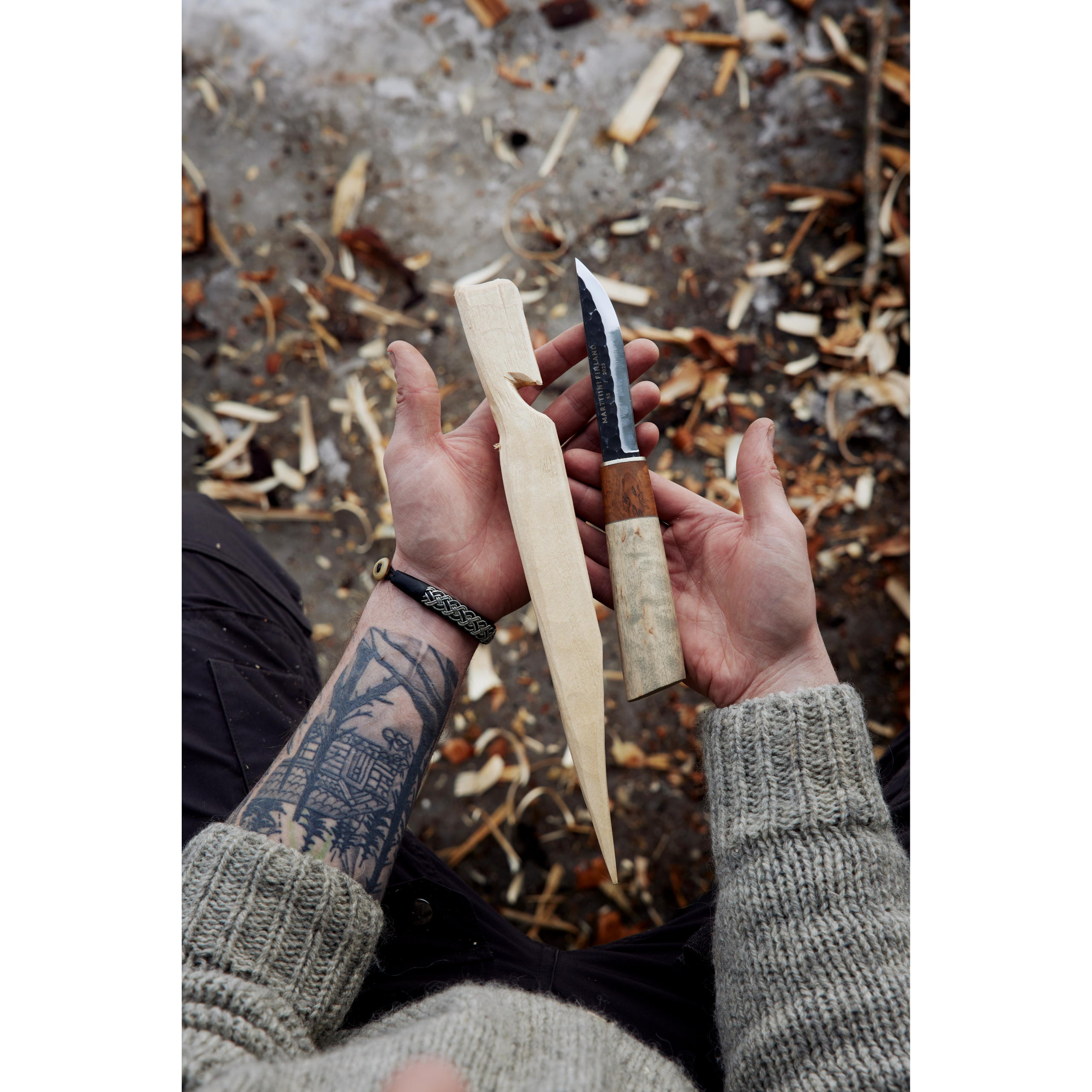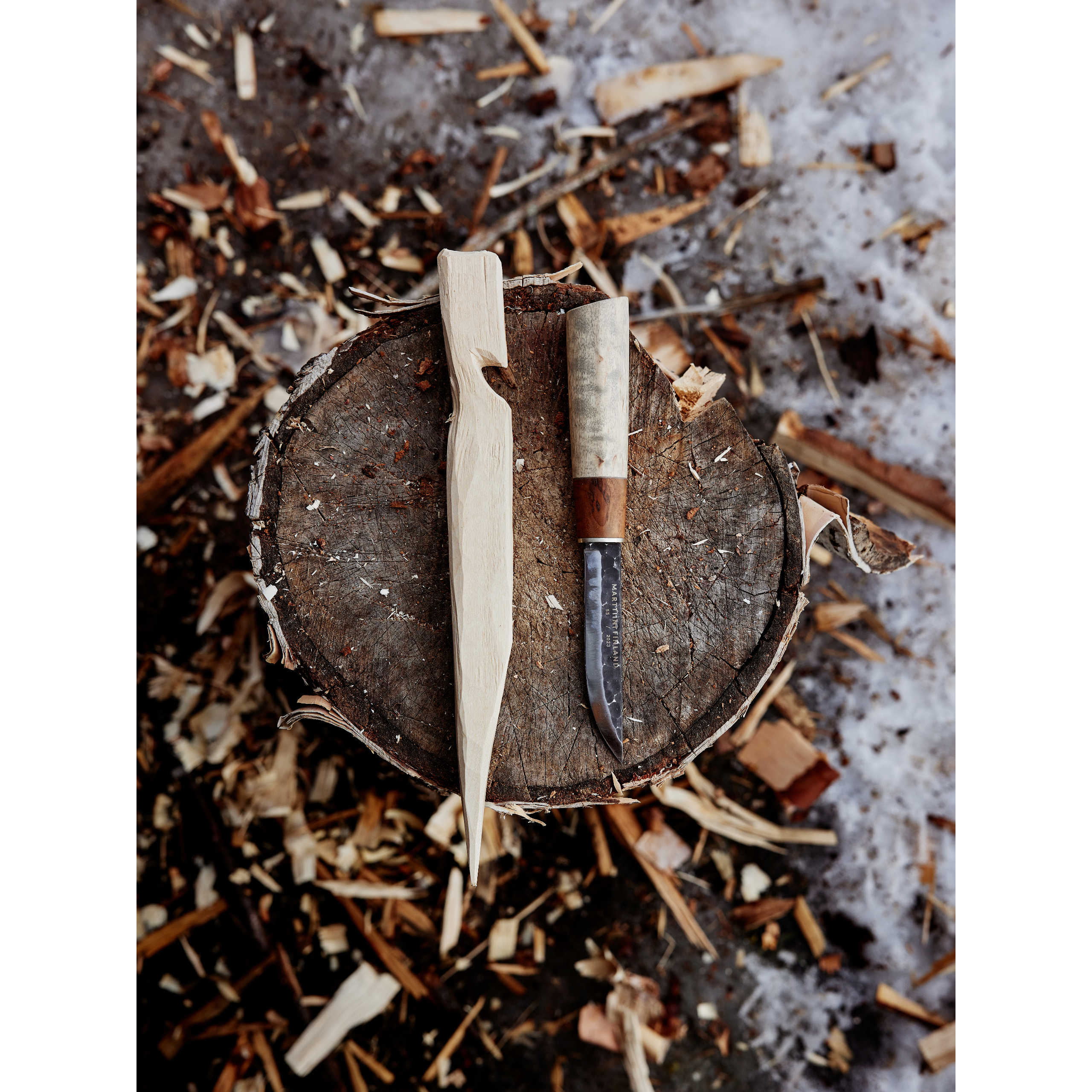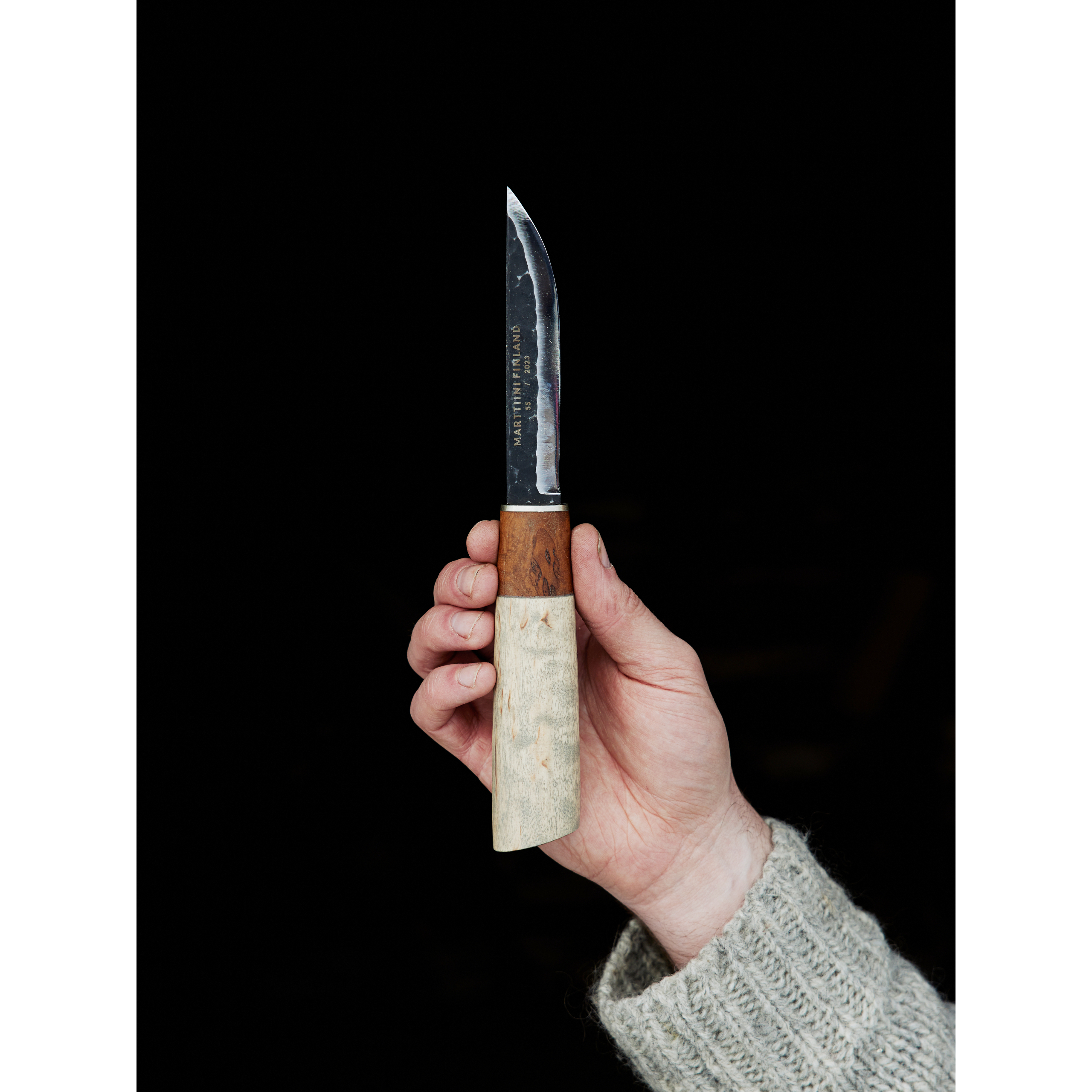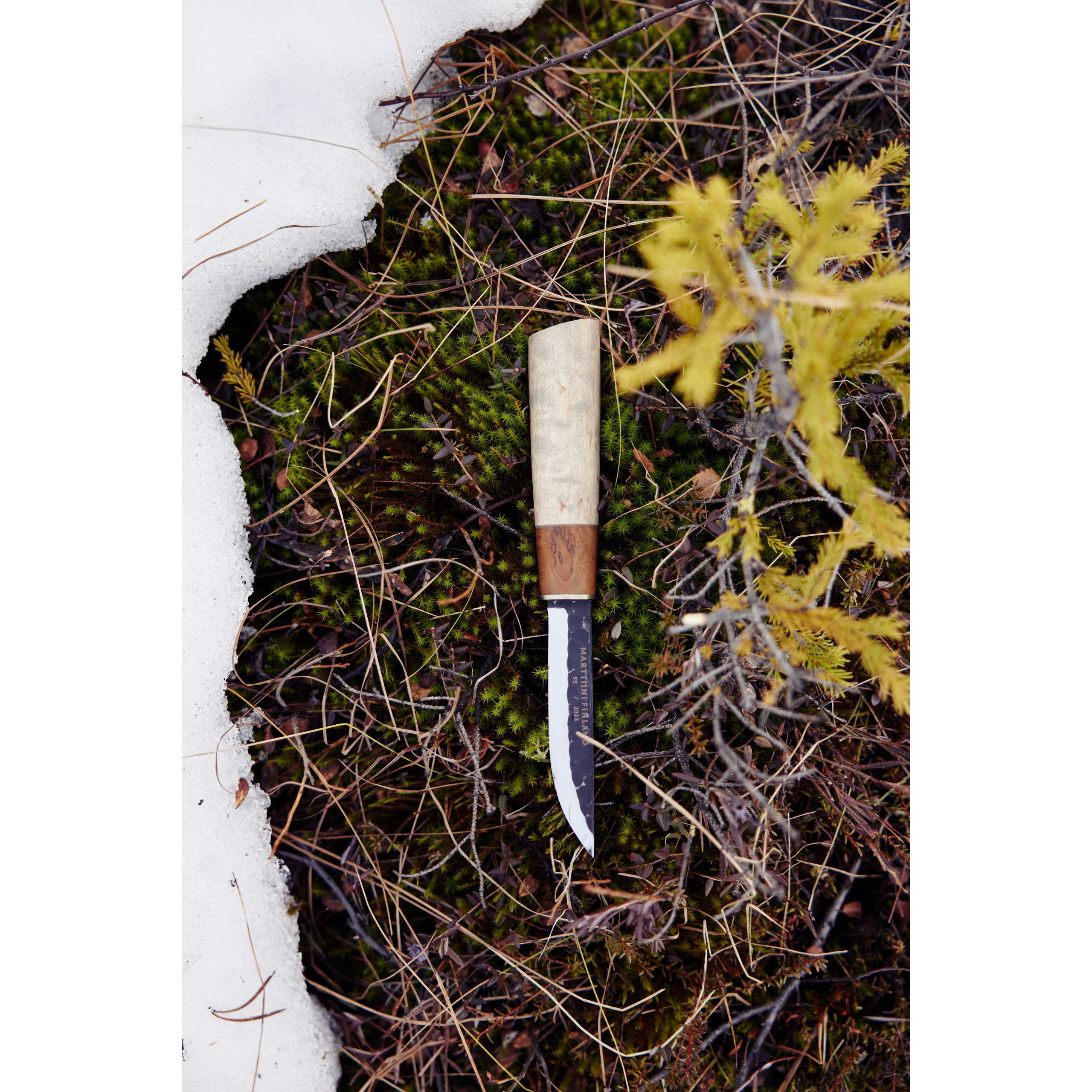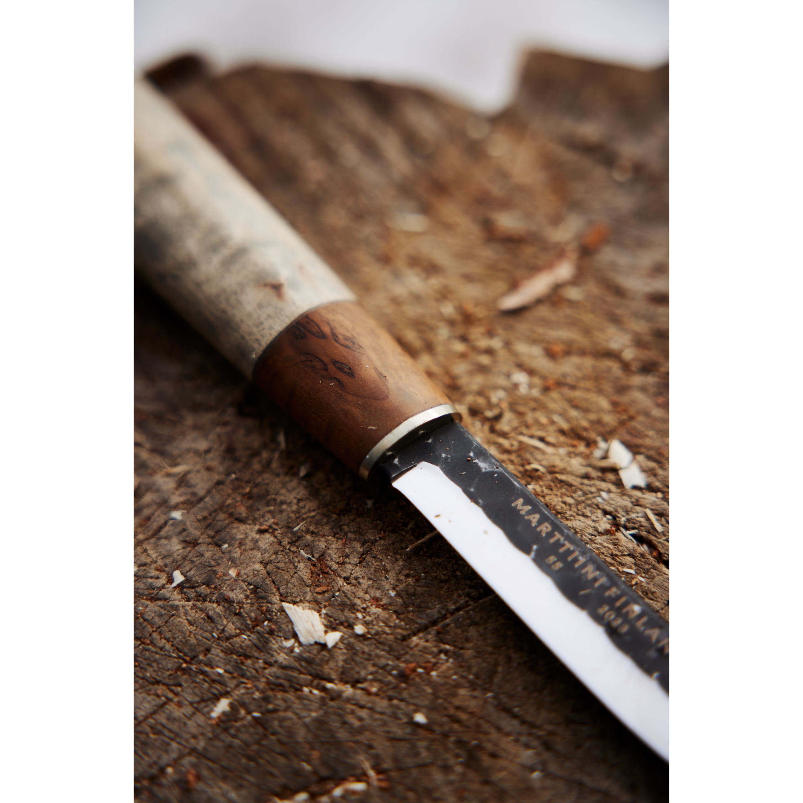 Das Jahresmesser 2023 des finnischen Herstellers Marttiini schöpft seine Inspiration aus dem Inneren der Erde, aus Ihren alten Gesteinsschichten und ist perfekt zum Schnitzen geeignet. Die Klinge des Messers, inspiriert vom felsigen Boden des Nordens und besteht aus geschmiedetem 80CrV2 Kohlenstoffstahl, welcher an die raue Oberfläche von Felsen erinnert. Der Griff wurde aus dunkler Maserbirke gefertigt und ist in einem stilvollen Grau gewachst. Der wärmebehandelte Streifen am Griff erinnert uns daran, dass auch im Inneren eines Felsens Wärme herrscht.