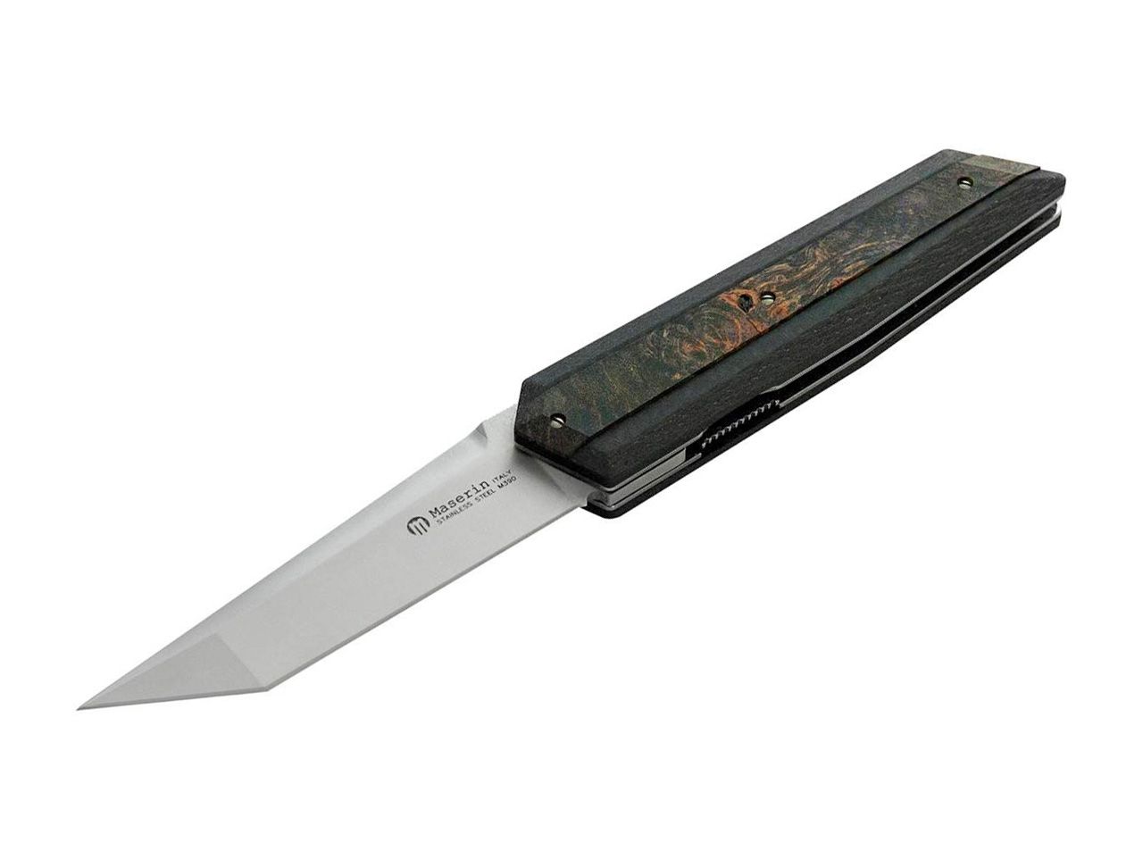 Das AM4 ist modernes Gentlemen-Messer des italienischen Herstellers Maserin, dass trotz der äußerst eleganten Erscheinung allen Aufgaben des Alltags gewachsen ist. Die satinierte Tanto-Klinge aus M390 ist kugelgelagert und wird komfortabel per Flipper geöffnet. Die Verriegelung übernimmt ein klassischer Linerlock. Die Griffschalen bestehen aus moderner Kohlefaser und sind mit Einlagen aus gefärbtem Wurzelholz versehen. Mit Clip.