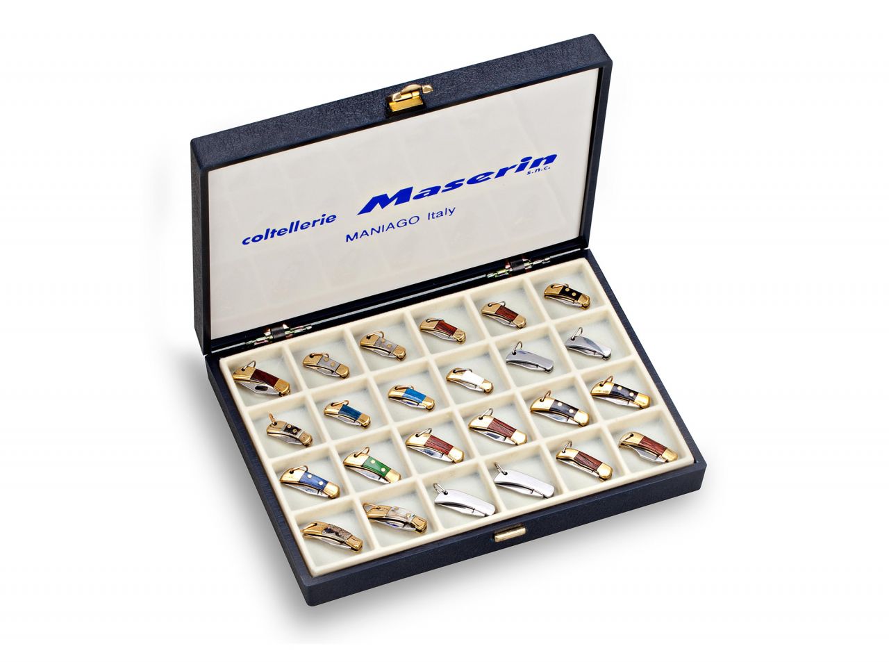 Dass Messer oft wahre Schmuckstücke sind, ist eine bekannte Tatsache. Nicht jeder Hersteller nimmt das jedoch so wörtlich. Die Messer der Serie Maserin Mignon sind voll funktionale Klappmesser mit einem Körper aus massivem Messing und einer sauber eingepassten Beschalung. Eine Rückenfeder (Slipjoint) hält die Klinge offen. Das besondere ist die Größe: Mit einer Gesamtlänge von gerade einmal 3,9 cm und einer Klingenlänge von 1,7 cm sind die Mignon dazu gedacht, als Anhänger an einer Halskette getragen zu werden. Die Öse erlaubt die einfache Anbringung.