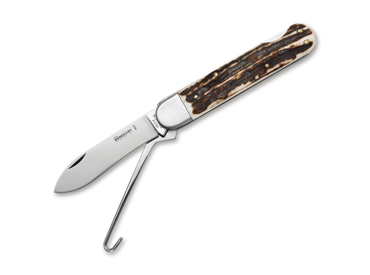Das klassische Taschenmesser ist mit einer Klinge aus Z50CD15 ausgestattet, die per Nagelhau öffnet und mit dem sicheren Backlock verriegelt wird. Zusätzlich verfügt das Messer über einen praktischen Haken. Die Edelstahlbacken bilden einen gelungenen Kontrast zu den Messingnieten in den Griffschalen aus edlem Hirschhorn.