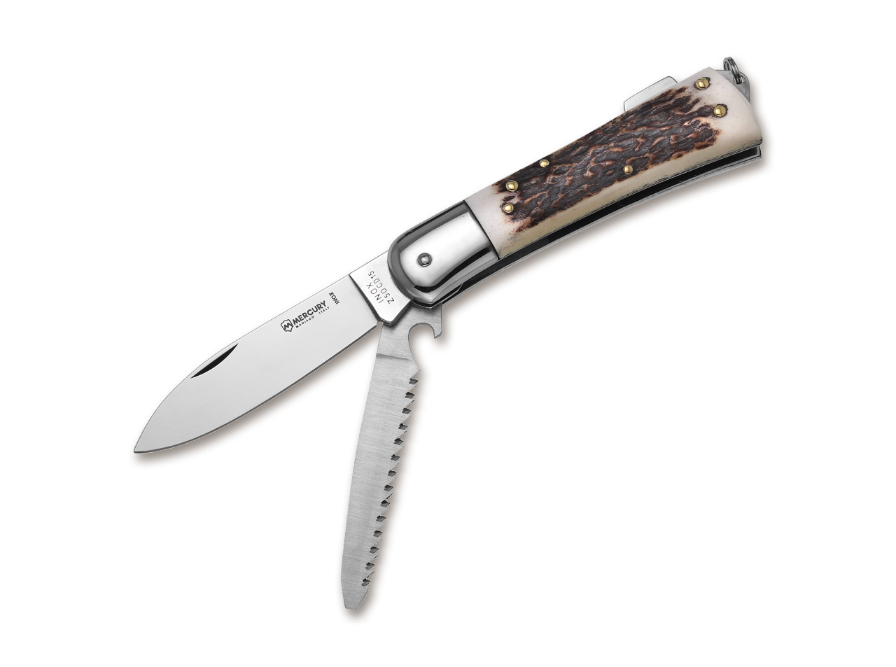Die robust ausgeführte Hunting-Serie von Mercury ist mit einer drei Millimeter starken Hauptklinge aus Z50CD15 ausgestattet, die per Backlock arretiert und verfügt zusätzlich über eine Säge. Edelstahlerle und Edelstahlbacken unterstreichen den stabilen Charakter und machen das Hunting 980 zum perfekten Begleiter im Revier. Mit Griffschalen aus klassischem Hirschhorn und Fangriemenöse.