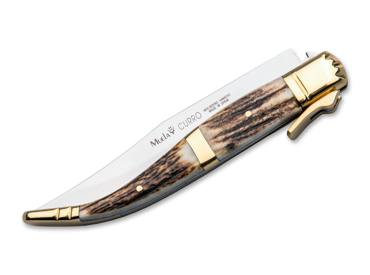 Das Muela Curro-A ist ein traditionelles spanisches Bandoleromesser in höchster Qualität. Die Griffbeschalung aus Hirschhorn mit Messingeinlagen verleiht dem Messer eine edle Optik. Die Klinge ist aus X50CrMoV15, einem hochwertigen Chrom-Molybdän-Vanadium-legierten Stahl gefertigt und traditionell nicht feststellbar. Lieferung in einer hochwertigen Schatulle.