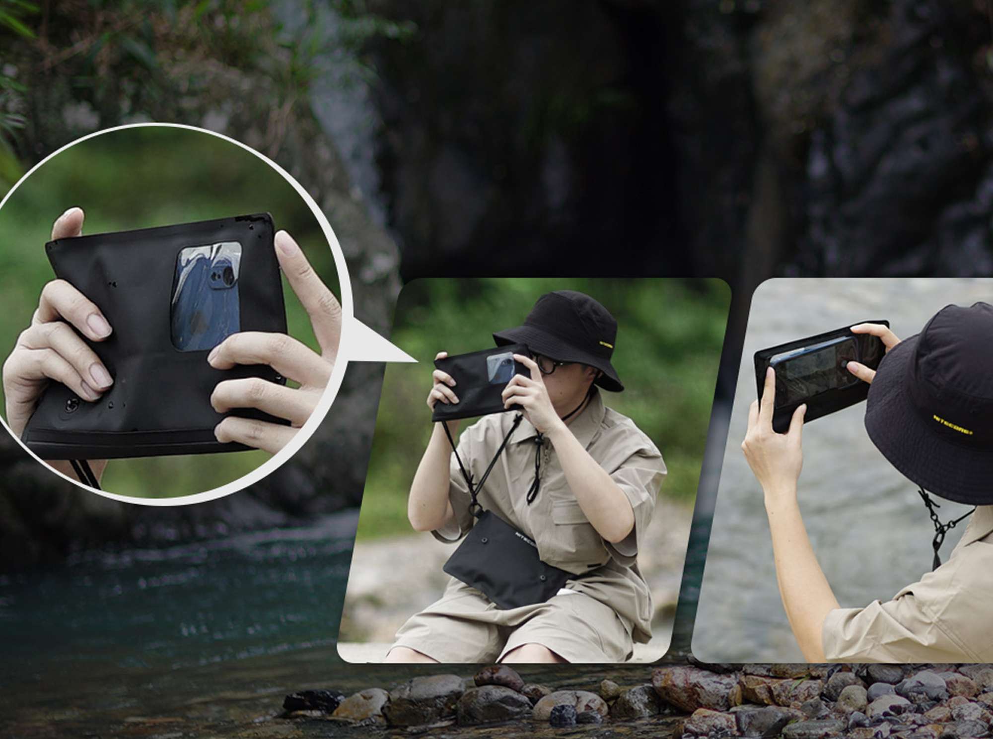 Die zweiteilige Umhängetasche ist der ideale Begleiter für all jene, die es actionreich mögen. Durch die wasserfeste Konstruktion können Smartphones und andere elektronische Kleingeräte vom Wildwasserrafting bis hin zum Camping sicher verstaut werden. Sichtfenster an Vor- und Rückseite geben den perfekten Überblick und erlauben das Erstellen von Fotos und Videos mit dem Handy, ohne es aus der Tasche herauszunehmen. Die Reißverschlüsse sind mit Gummilippen versehen und verhindern ein Eindringen von Wasser. Abmessungen: 23,5 cm x 17 cm.