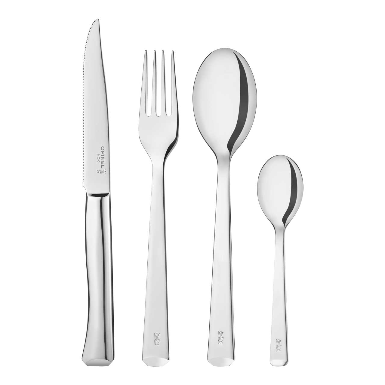 Perpetue. In Zusammenarbeit mit dem Design-Studio BIG GAME ist Opinel zu den Wurzeln der Marke zurückgekehrt. Zu den Wurzeln des Designs, mit Anspielungen auf die historischen Formen der Opinel Messer. Zu den Wurzeln der Familie, in dem Sie eine Frau würdigen: Perpetue Opinel (1813-1858), die Großmutter des Gründers des Unternehmens, Joseph Opinel. An der Seite ihres Ehemanns Victor-Amedee schmiedete sie Nägel im Herzen der Alpen, in Savoyen. Opinel hat sich gewagt, sich vorzustellen, dass sie Objekte in schlichter, zeitloser Ästhetik liebte, robust und beständig. Die Perpetue Besteckset Box besteht aus 4 Messern mit angenehm gebogenem Griff und mikrogezahnter Klinge, 4 Gabeln, Löffeln und Teelöffeln in klaren Linien. Das Besteckset Perpétue ist aus rostfreiem Stahl, Monoblock, für die Spülmaschine geeignet. Die Messer sind aus Stahl X20Cr13, Gabeln, Löffel und Teelöffel aus Stahl X5CrNi18-10.