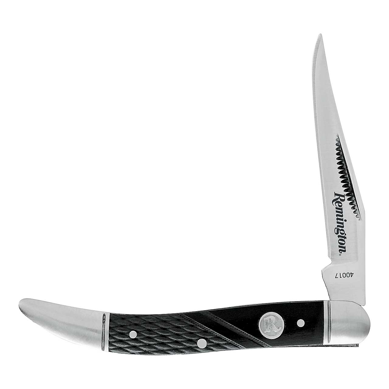 Die limitierte Sammelbox von Remington beinhaltet gleich zwei praktische Taschenmesser. Das kleine, sogenannte Toothpick Messer ist mit einer rostfreien Klinge aus 420J2 Stahl ausgestattet und wird durch eine kräftige Rückenfeder in Arbeitsposition gehalten. Die Klinge des größeren Einhandmessers ist ebenfalls aus 420J2 Stahl gefertigt, wird jedoch durch einen Liner Lock Mechanismus zuverlässig arretiert. Das Toothpick Messer verfügt über Heftschalen aus dunklem Pakka-Holz, während das größere Messer durch Griffschalen aus schwarz anodisiertem Aluminium sowie einem Taschenclip überzeugt. Beide Griffe erinnern vom Design her an die klassischen Remington Pistolengriffe. Das Set wird in einer attraktiven Geschenkbox mit typisch amerikanischem Landschaftsmotiv geliefert. Einhandmesser Klingenlänge 7,0 cm, Heftlänge 10,0 cm, Gewicht 98 g, Taschenmesser Toothpick Klingenlänge 5.8 cm, Heftlänge 7.5 cm, Gewicht 24 g