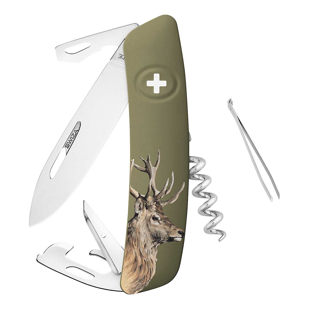 Mit der SWIZA D05 Jagd-Kollektion erweitert SWIZA sein attraktives Taschenmessersortiment. Die robuste Säge aus Inox-Stahl ist korrosionsbeständig und durch die Geometrie des Sägeblattes sägt sie sauber ohne dabei zu verklemmen. Die 75 mm lange Klinge aus Edelstahl 440 (gehärtet auf 57 HRC) arretiert und lässt sich durch Druck auf das Schweizer Kreuz - Markenzeichen von Swiza - wieder einklappen. Die leichte Krümmung des Messers ermöglicht ein müheloses Aufklappen aller Werkzeuge, die oliv-farbene Anti-Rutsch-Oberfläche mit Hirsch-Motiv erleichtert eine intuitive Handhabung. Das D05 besitzt außerdem eine Stech- und Bohrahle, die Kombi-Werkzeuge Flaschenöffner/Schlitzschraubenzieher Nummer 3 sowie Dosenöffner/Schlitzschraubendreher Nummer 1, eine Pinzette mit abgeschrägter Spitze und einen Sommelier-Korkenzieher mit 5 Windungen. D05 - 12 Funktionen: Klinge 75mm, Klinge mit Sicherheitsblockierung, Säge, Stech- und Bohrahle, Nähahle, Flaschenöffner, Schraubendreher Nr. 3, Drahtbieger, Dosenöffner, Schraubendreher Nr. 1, Sommelier-Korkenzieher, Pinzette.