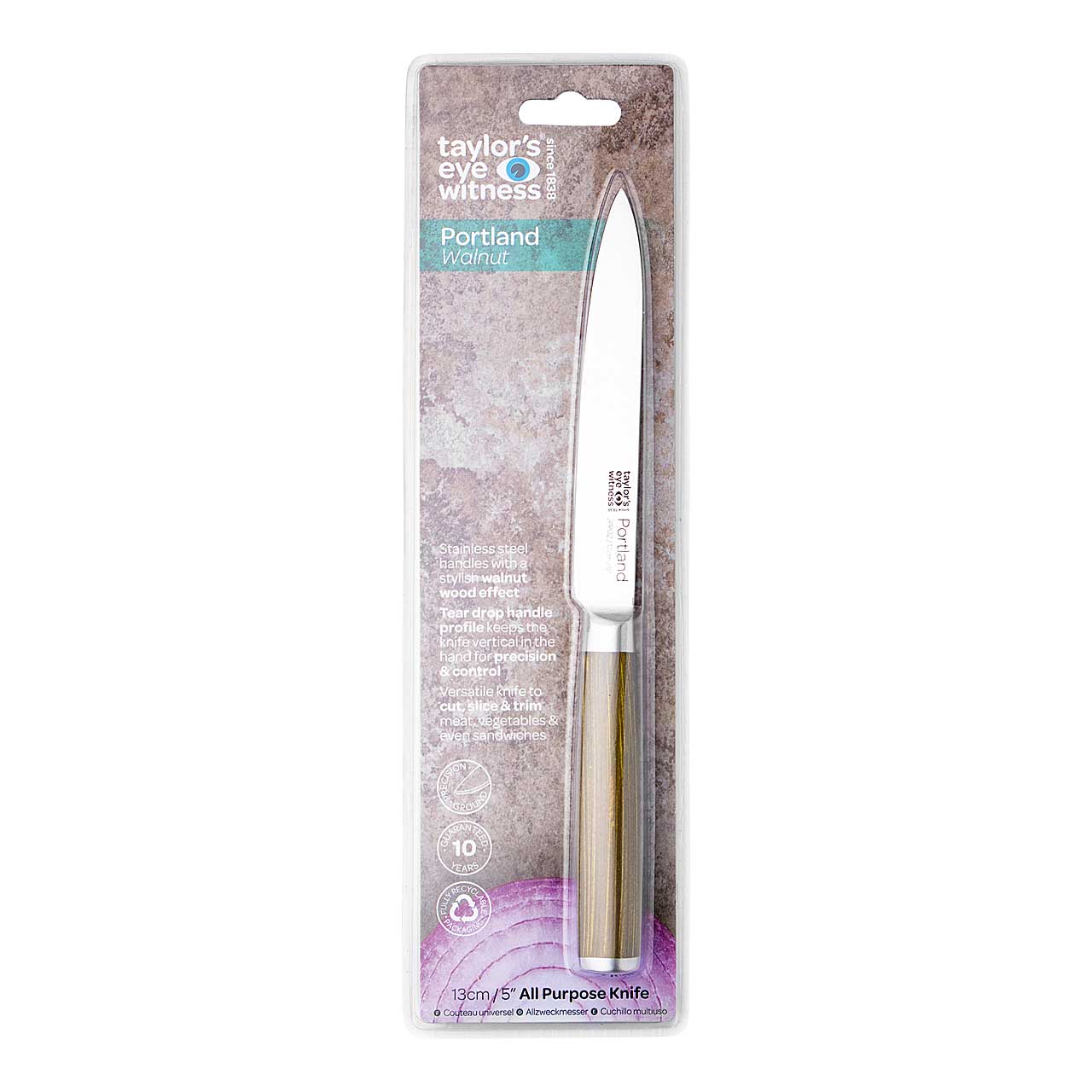 Mit der Serie Portland bietet Taylor's Eye Witness eine dekorative Küchenmesserserie zu einem attraktiven Preis an. Das Messer verfügt über eine Klinge aus rostfreiem AISI 420Stahl. Der Griff aus rostfreiem Stahl hat einen Walnussholz-Effekt. Das Allzweckmesser bietet einen idealen Kompromiss für alle, die ein handliches Messer bevorzugen, das aufgrund seiner längeren Klinge jedoch auch zum Schneiden von Fleisch oder auch zum Filetieren verwendet werden kann. Zum Reinigen in der Spülmaschine geeignet, Handwäsche empfohlen.