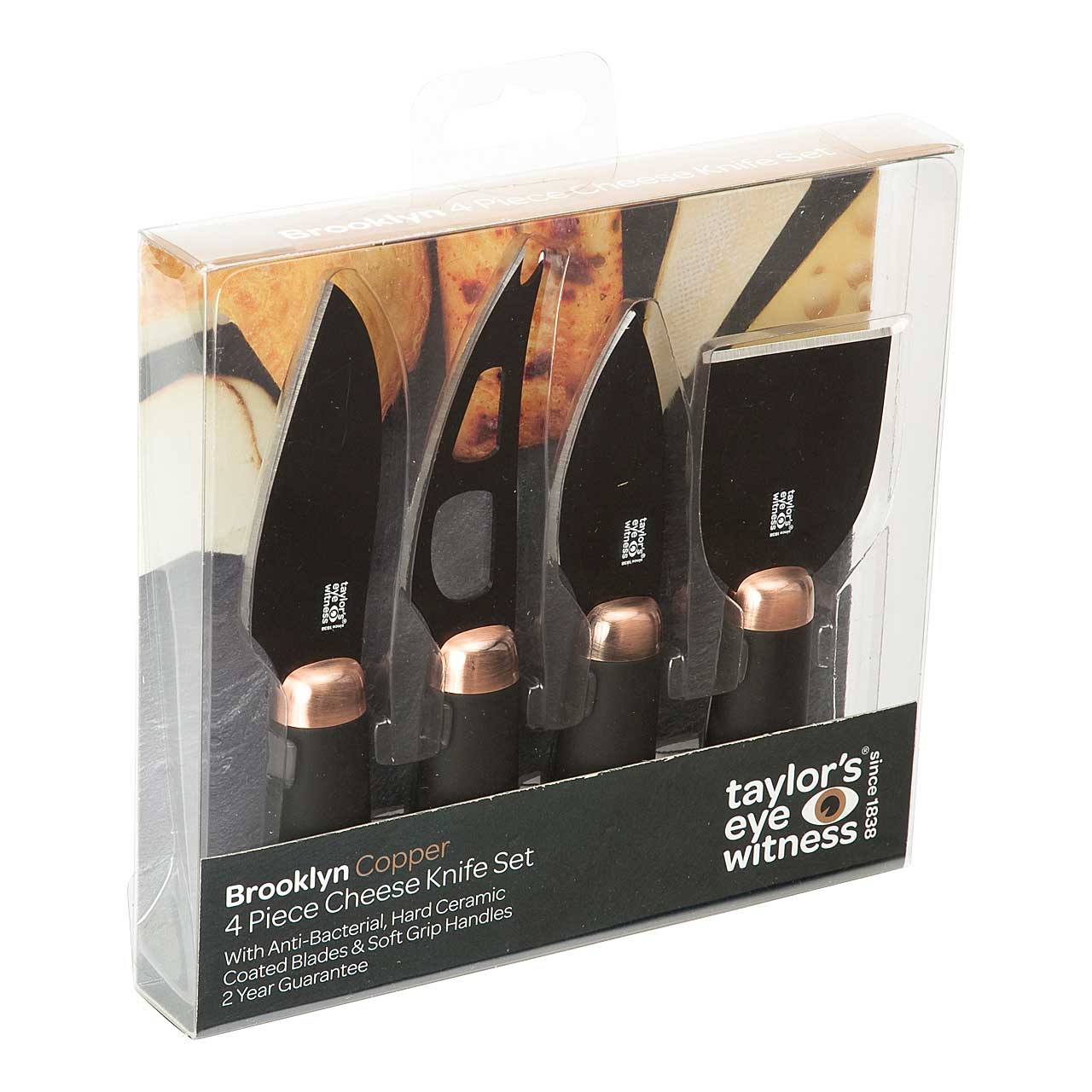 Gut gerüstet für unterschiedliche Käsevarianten wie Weich-, Hartkäse oder auch Parmesan ist man mit dem von Taylor's Eye Witness angebotenen vierteiligen Messerset aus der Serie Brooklyn. Die schwarz antihaftbeschichteten Klingen und die Kunststoffgriffe mit einer SoftGrip-Oberfläche sorgen für ein modernes Design. Antibakteriell und spülmaschinenfest.
