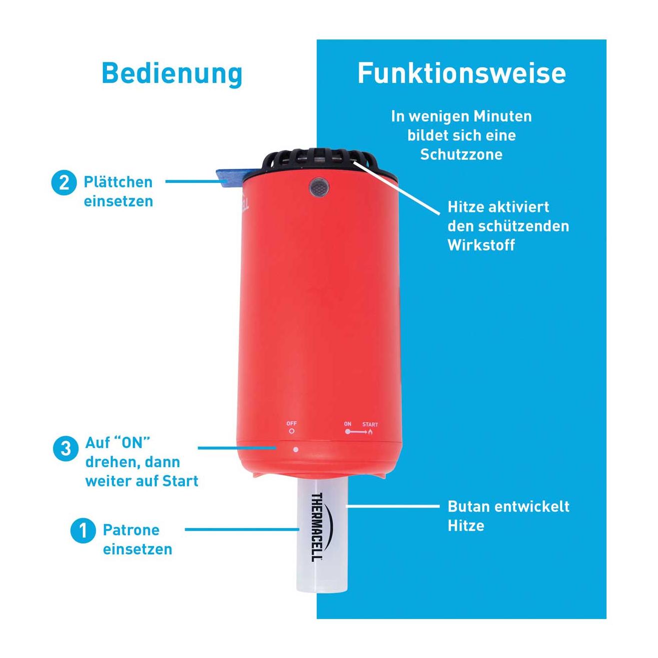 Mückenschutz in modernem Design: Das rote Thermacell HALO Mini macht auf jedem Campingtisch auch optisch einen guten Eindruck. Die Thermacell-Technologie bietet einen effektiven Schutzbereich von etwa 20 Quadratmetern, der bis zu 98% Stechmücken und ähnliche blutsaugenden Insekten fernhält. Für die Mückenbekämpfung werden Wirkstoffplättchen, die mit einem Mini-Butangasgrill mit Piezozündung (keine offene Flamme) erhitzt werden und einen der Natur nachempfundenen Abwehrstoff abgeben, verwendet. Das HALO Mini ist kinderleicht zu bedienen und sicher im Betrieb. Da die Abwehrstoffe nahezu geruchlos sind, ist Thermacell die ideale Alternative zu Lotionen und Sprays, die auf die Haut aufgetragen werden. Eine Erstausstattung an Verbrauchsmaterial (Butangaspatrone und 3 Wirkstoffplättchen) für 12 Einsatzstunden gehört zum Lieferumfang.