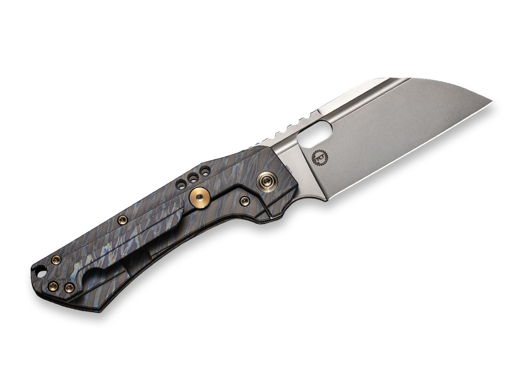 Das rustikale WE Knife Roxi lässt keine Zweifel offen und punktet mit einer Sheepfoot-Klinge aus pulvermetallurgischem CPM-S-35VN und einem edlen Titangriff in Tigerstreifen-Optik. Der alltagstaugliche Framelock Folder öffnet per Daumenöffnung und ist mit einigen Zierelementen wie einer Hohlkehle sowie gewichtssparenden Löchern im Griff versehen. Mit Fanrgiemenöse und Clip (Tip-up/r).