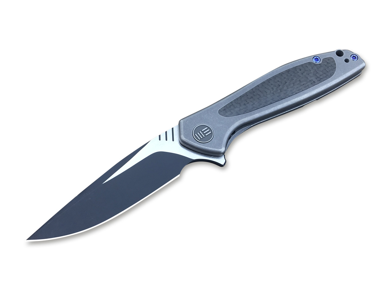 Titan-Framelock mit beidseitiger Griffeinlage und Rückenstück aus Kohlefaser und einer kugelgelagerten Klinge aus dem pulvermetallurgischen CPM-S35VN. Titanclip, aus dem Vollen gefräst.