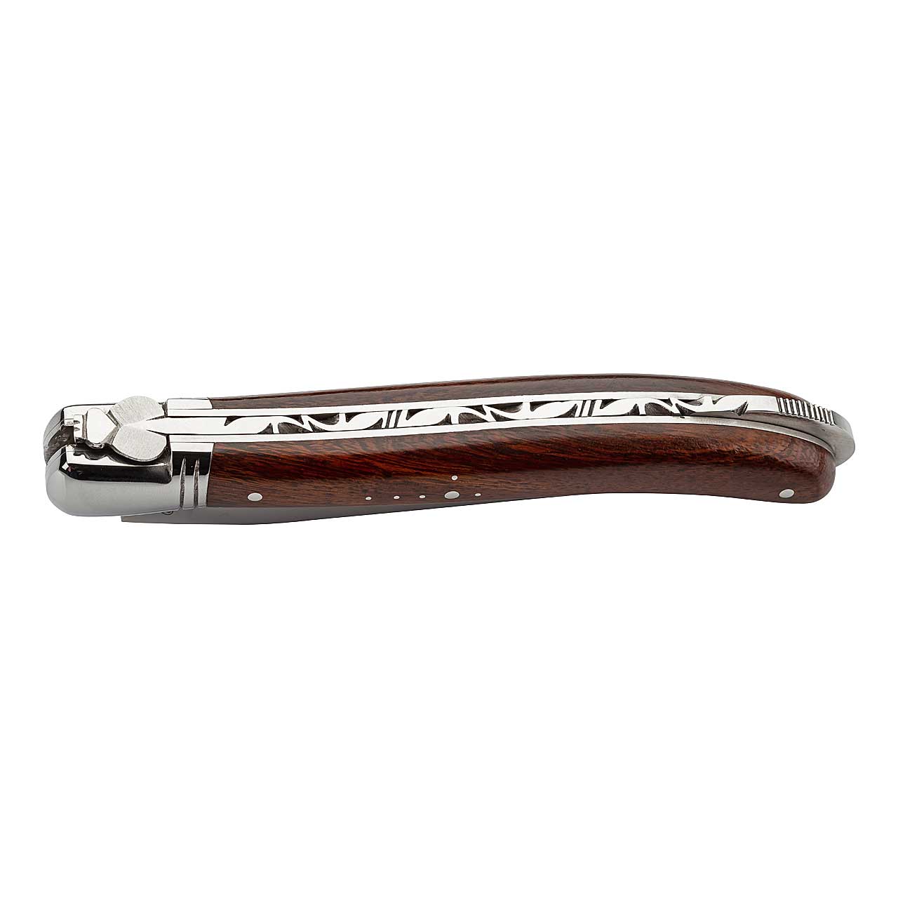 Griffschalen aus edlem Eisenholz und eine rostfreie Klinge aus hochwertigem Schwedenstahl 12C27 zeichnen das Laguiole Messer NATURE aus dem Hause Fontenille Pataud in besonderem Maße aus. Über das Backlock-System lässt sich die Klinge sicher feststellen und nach Gebrauch wieder entriegeln. Der für Laguiole typische Zierschliff am Messerrücken, die Biene und die Schäferkreuz-Verzierung am Griff runden das attraktive Erscheinungsbild stilvoll ab.